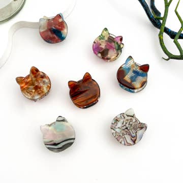 Ginger Small (2 inch) Adorro Exclusive: designed in Chicago Cat lovers are in for a treat! The Ginger claw clip is the perfect size for a quick up do. Features hand painted details. Assorted pack includes: 12 individual clips Measurements: 1.5" x 2" Materials: Cellulose Acetate (eco-friendly material) Cellulose Acetate is a synthetic fiber produced from plant derivatives such as wood pulp and cotton. CA is both durable and biodegradable. *Actual colors may vary slightly from what appears online due to lighting and differences in monitors.