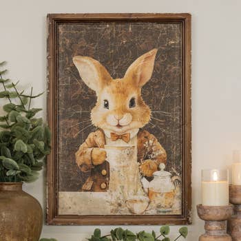 This Spring Print of a Hare/Bunny Sitting is printed on canvas and frame in a wooden oval frame measuring 91/2 inches by 11 inches. Made of Canvas and Wood Proudly made in the United States of America