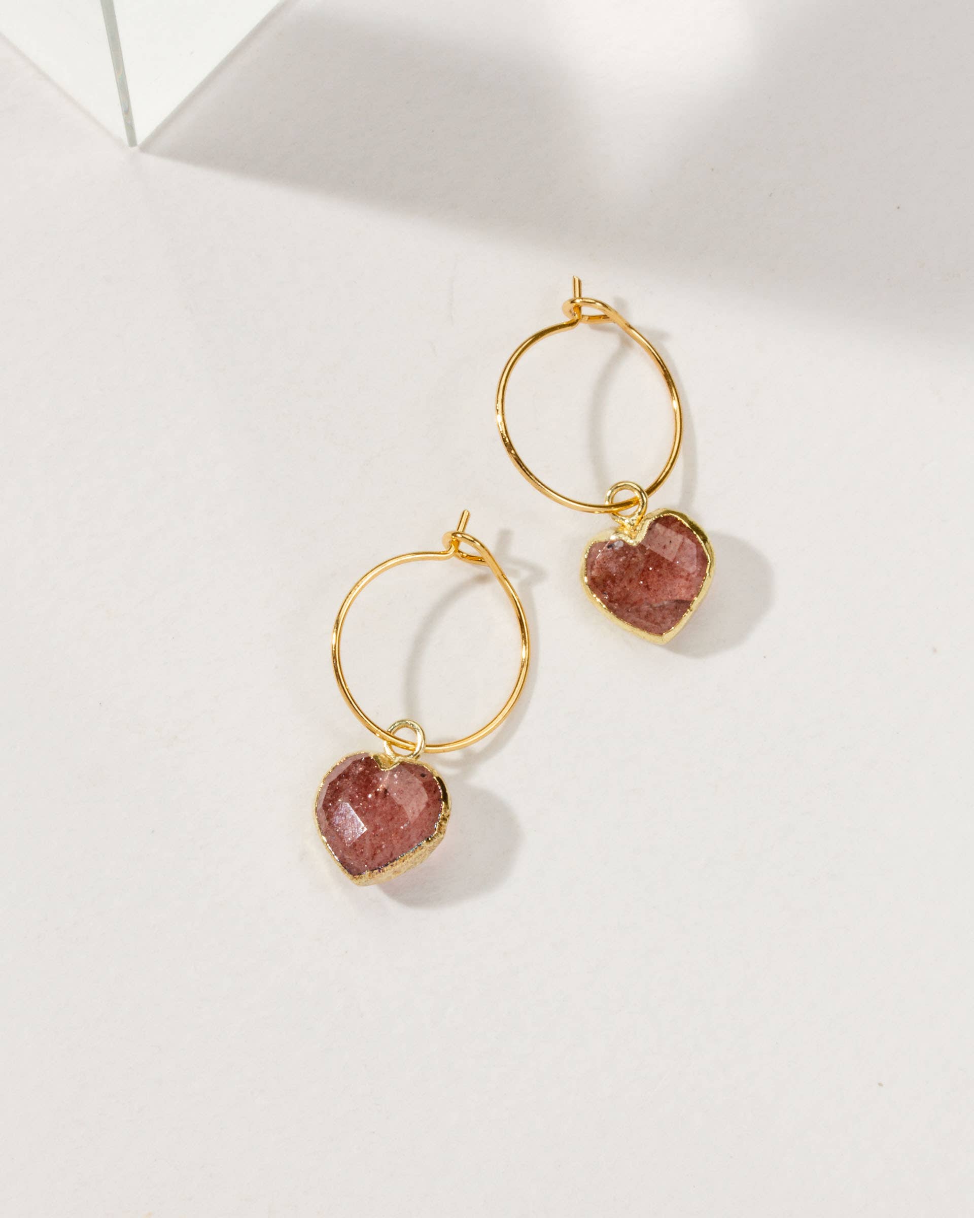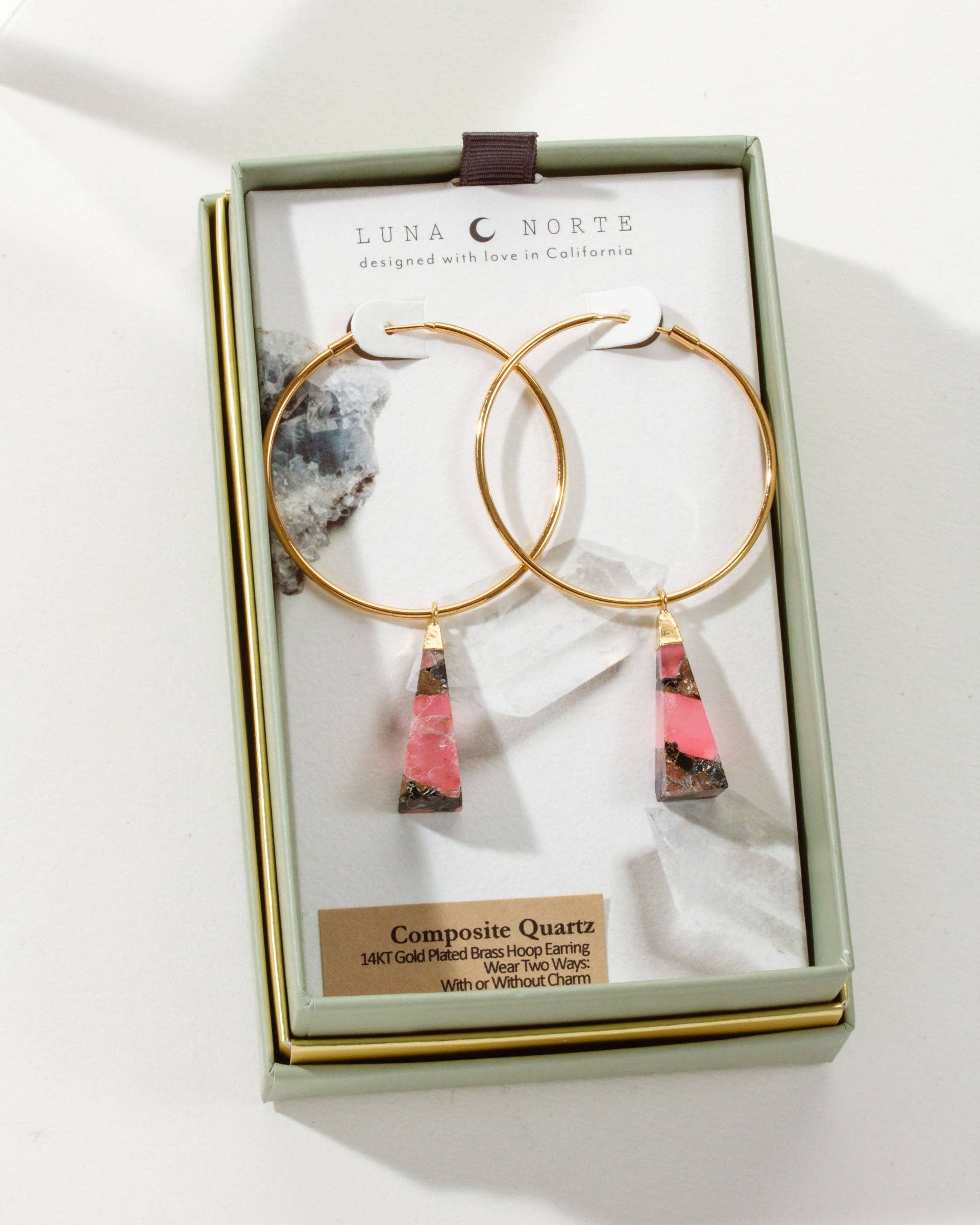 Style Details: Genuine Herkimer quartz mini hoop earrings 14kt plated sterling silver ⅜″ length, ¼″ width (Each stone is unique. Size and shape may vary slightly). Hoop diameter: ½″ Assembled in the USA with imported components. Carded.