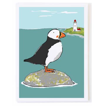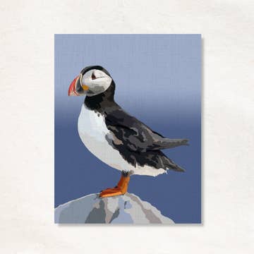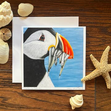 The Atlantic Puffin has nesting colonies on several remove islands in my home state of Maine. This card is a fine art print of original acrylic painting titled “Puffin’s Catch”. Details: 5.25” x 5.25” Signed by artist, Heidi Beal Fun fact about subject on back Blank inside White envelope included Clear sleeve Perfect for framing Created, printed, and packaged by the artist in Jonesport, Maine