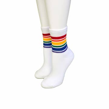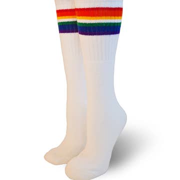 Share your unique beauty and happiness with rainbow striped tube socks. Dance, run, and most importantly, rock to your own beat! These vintage tube socks are approximately 22 inches. Expect them to be: -over-the-knee for kids -knee-high for most adults -mid-calf for tall adults Material: 75% Ring Spun Cotton, 14% Nylon, 7% Acrylic, 4% Spandex and proudly made in the USA!