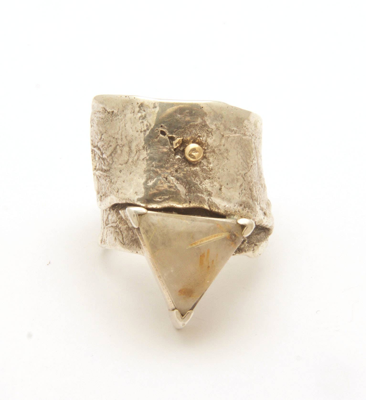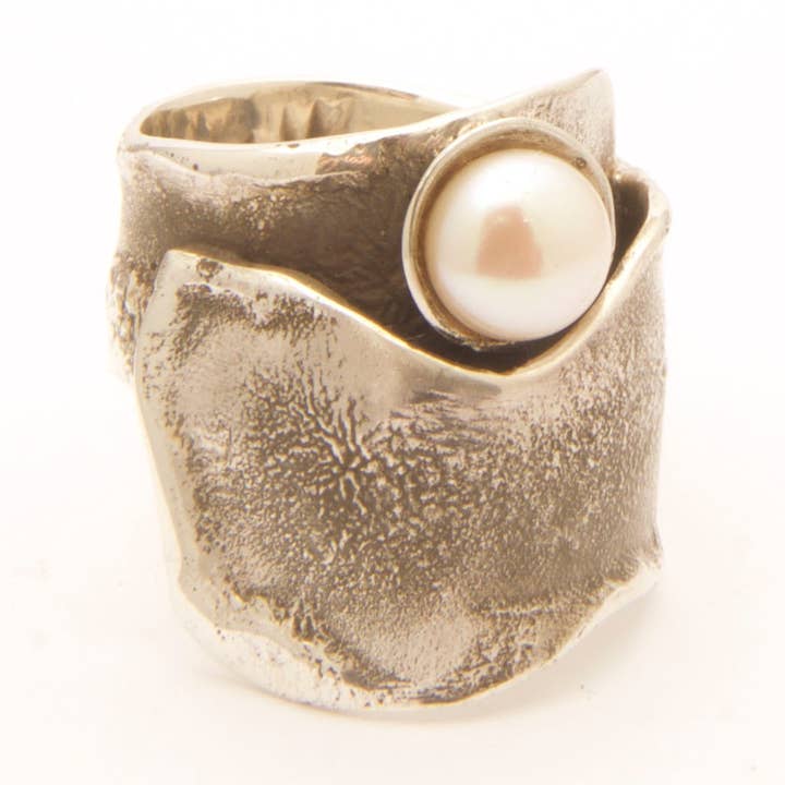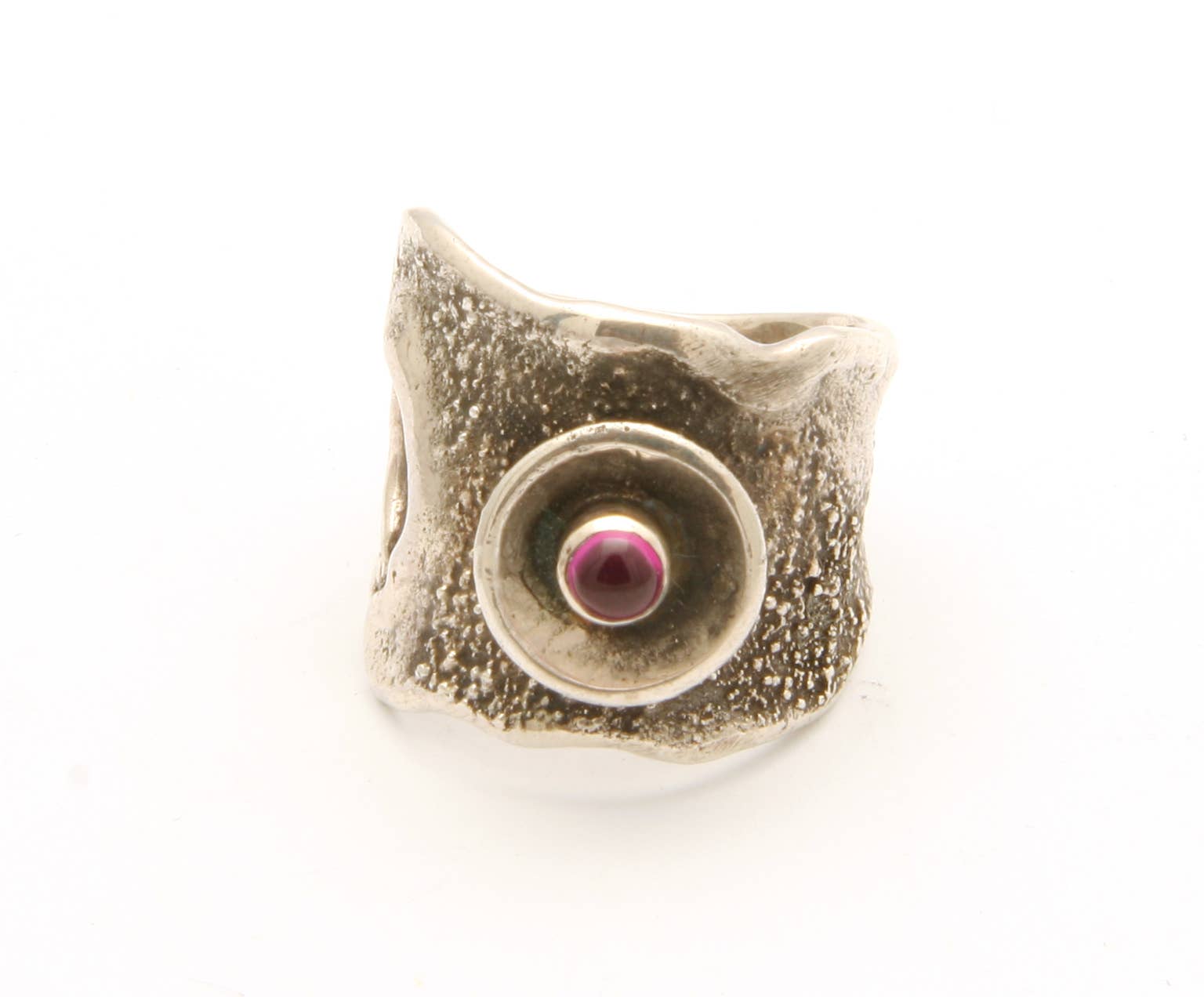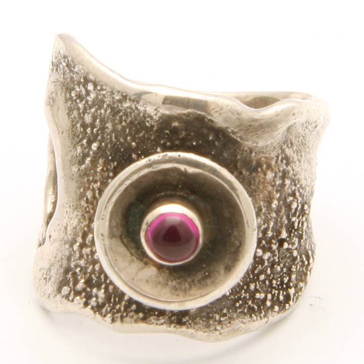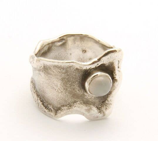 Sterling silver reticulated ring with oval bezel set stone. Width 1 1/4 inches wide.