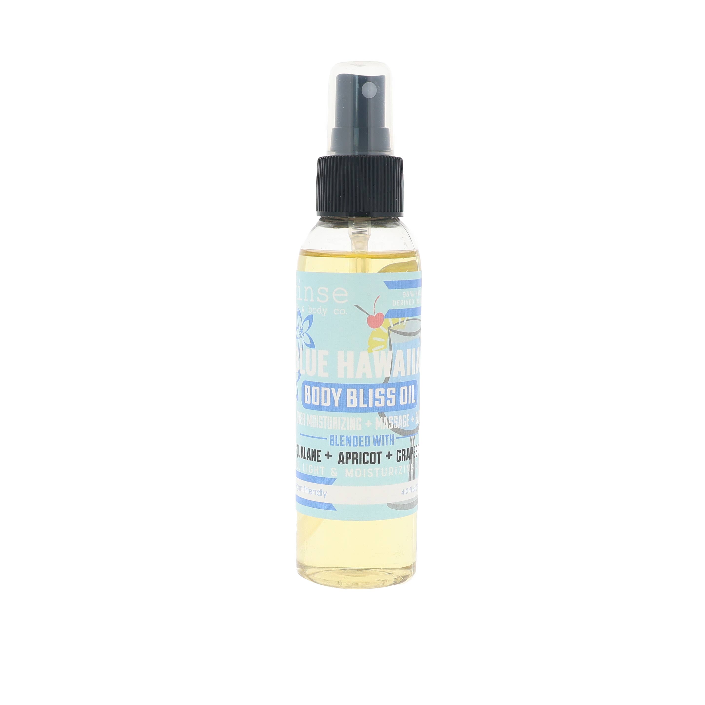 An all-over body moisturizing oil, a bath oil or a massage oil that soaks right into the skin leaving a natural moisturized glow behind that lasts & lasts. Because it is a blend of light oils, Body Bliss will not lay on the skin making it oily or greasy. Coconut Mango: Beachy, but not cheesy beachy. There's just enough coconut to tone down the zing of the mango but not enough to overpower the blend. Tip #1: A little bit goes a long way. Tip #2: Keep the bottle in the shower, when finished turn the water off, spray on, rub in then pat yourself dry. Made with 98% naturally derived ingredients gluten-free vegan-friendly 4 fl. oz. GREAT for putting on after shaving for shiny, smooth legs!