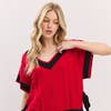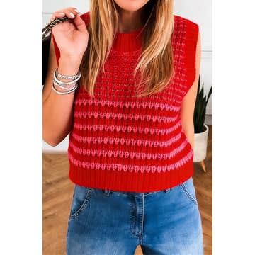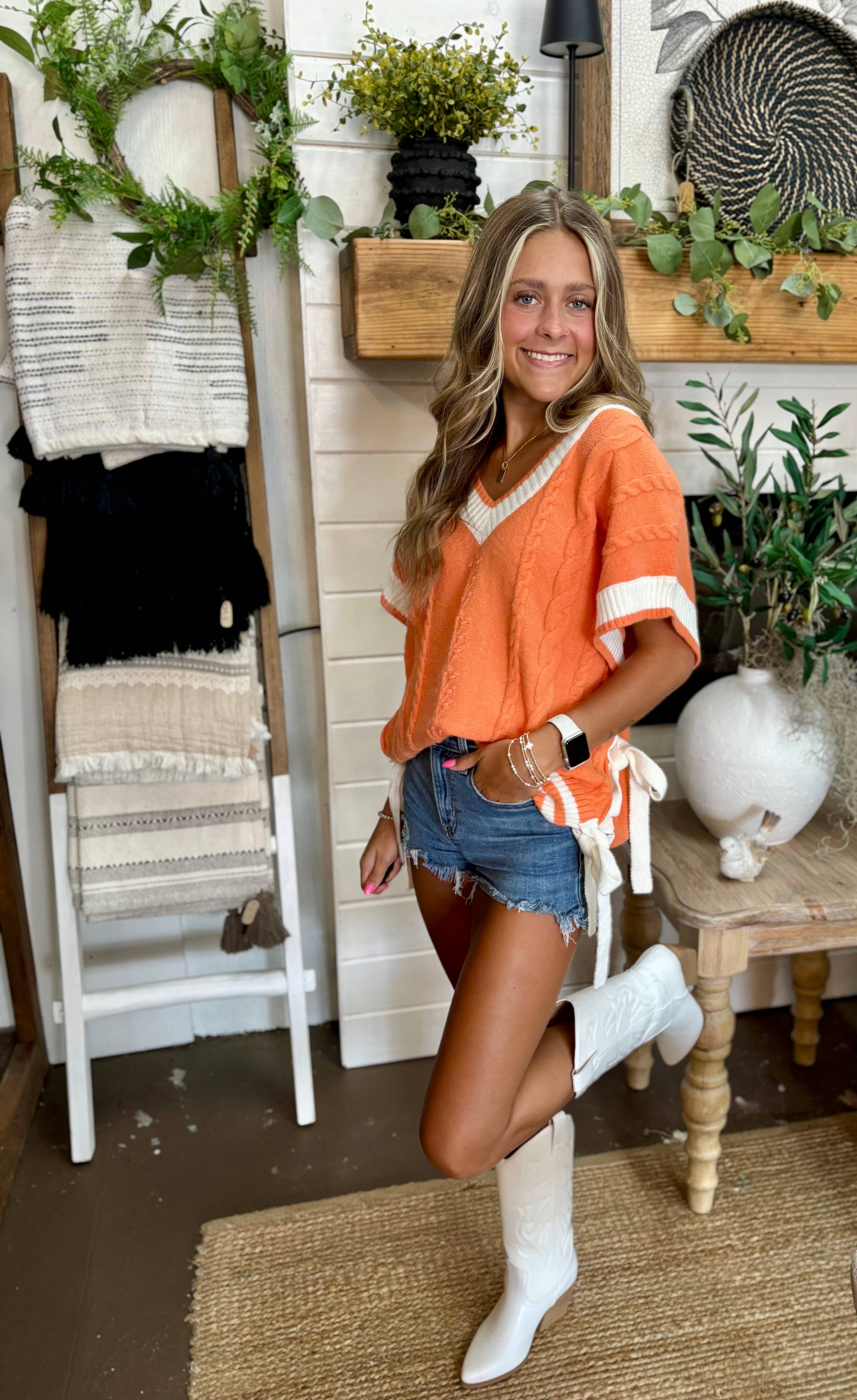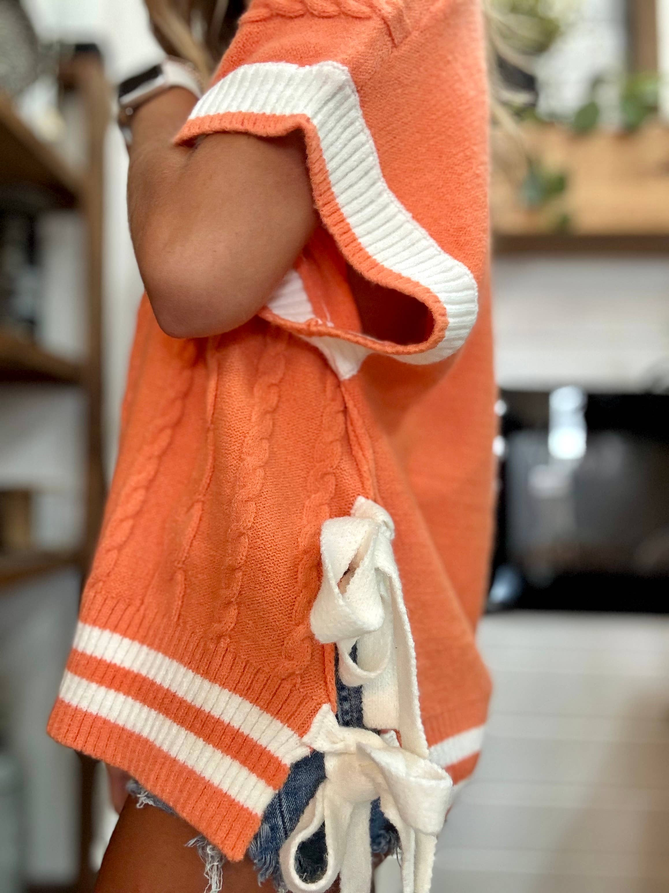 This cable knit sweater vest features bold varsity-inspired contrast trim, a flattering V-neckline, and playful side ties for a feminine touch. The oversized fit and textured knit design make it a cozy yet stylish statement for layering over your favorite game day look. gameday top, varsity sweater vest, football outfit, cable knit vest, oversized knit top, preppy gameday look, knit v neck vest, gameday orange, cheer sweater, college game day, side tie knit top, loose fit varsity, sporty chic sweater, cozy football outfit, statement knit vest HPS: 22 1/4" BUST: 20 1/4"
