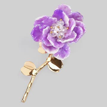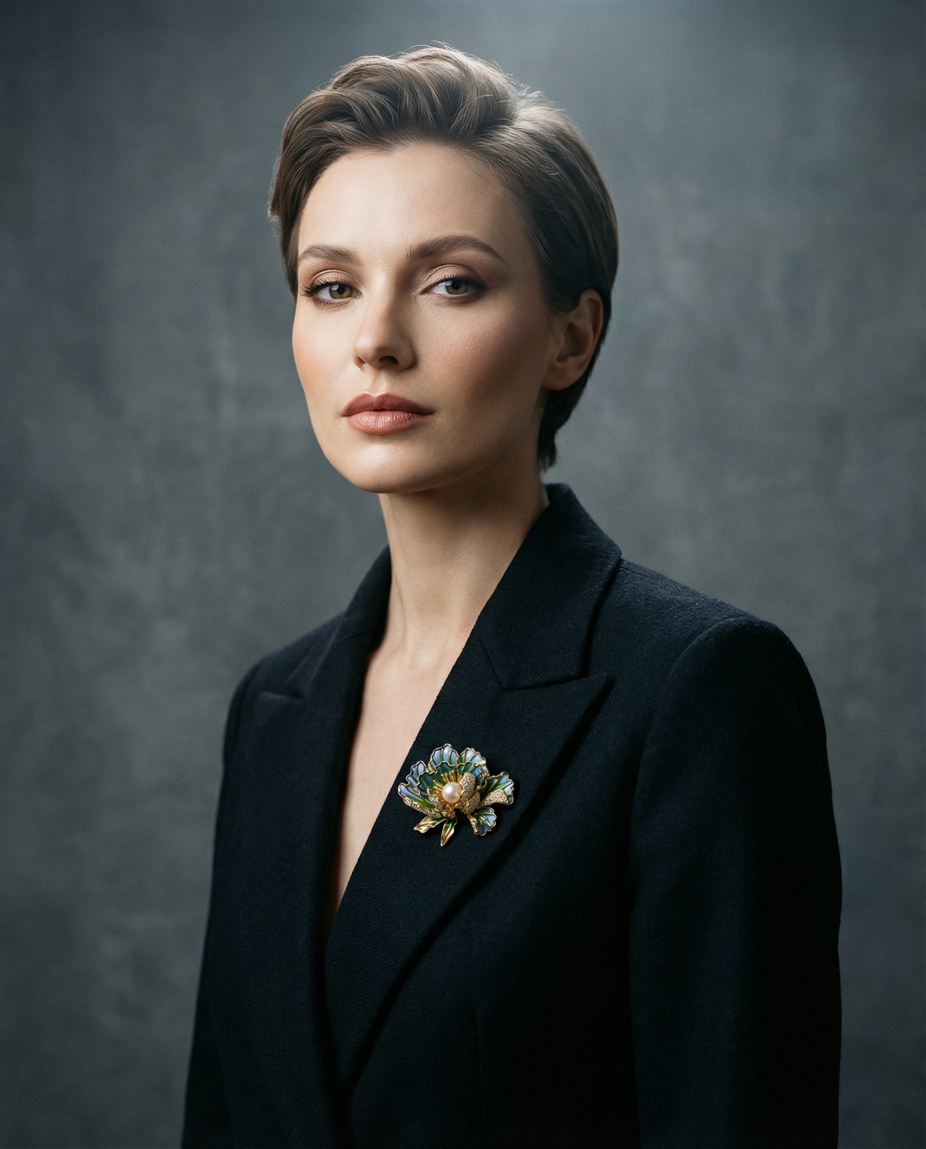 A brooch that commands attention through its stillness. Its floral design, rich in volume and detail, unfolds like a noble flower in full bloom, with a central pearl acting as its heart and point of balance. The golden tones and green accents evoke tradition, strength, and an understated elegance. Designed for women of strong character, this brooch transforms a dark jacket into a statement of serene authority and timeless sophistication. It is not an accessory: it is a centerpiece, destined to last and be remembered.