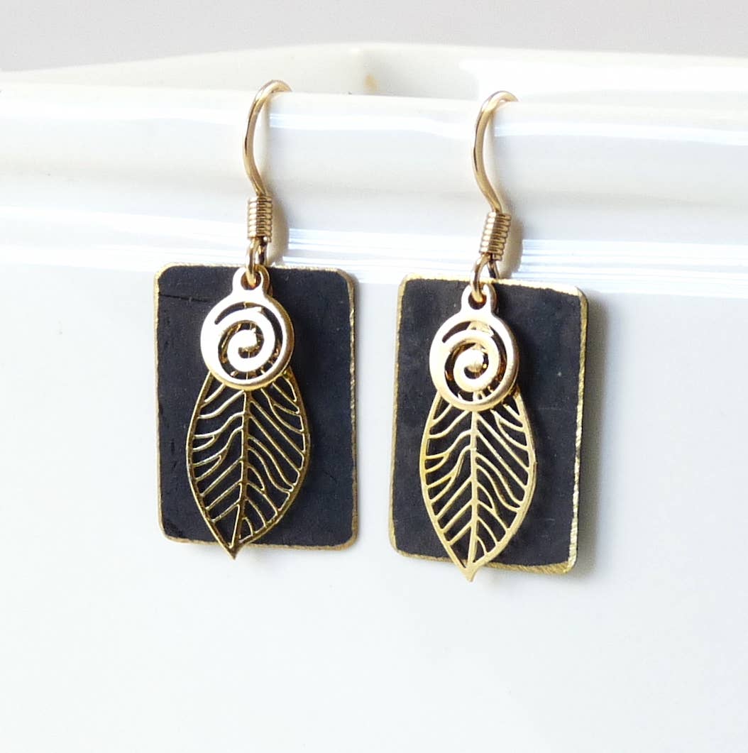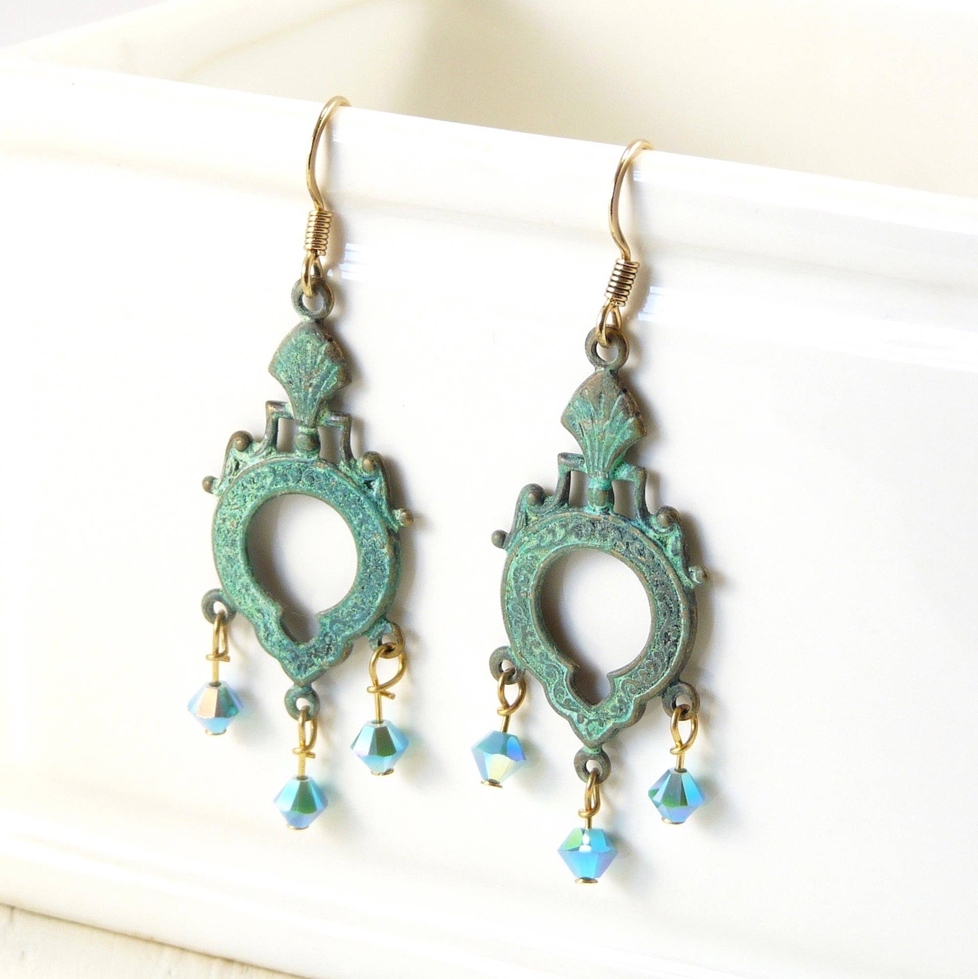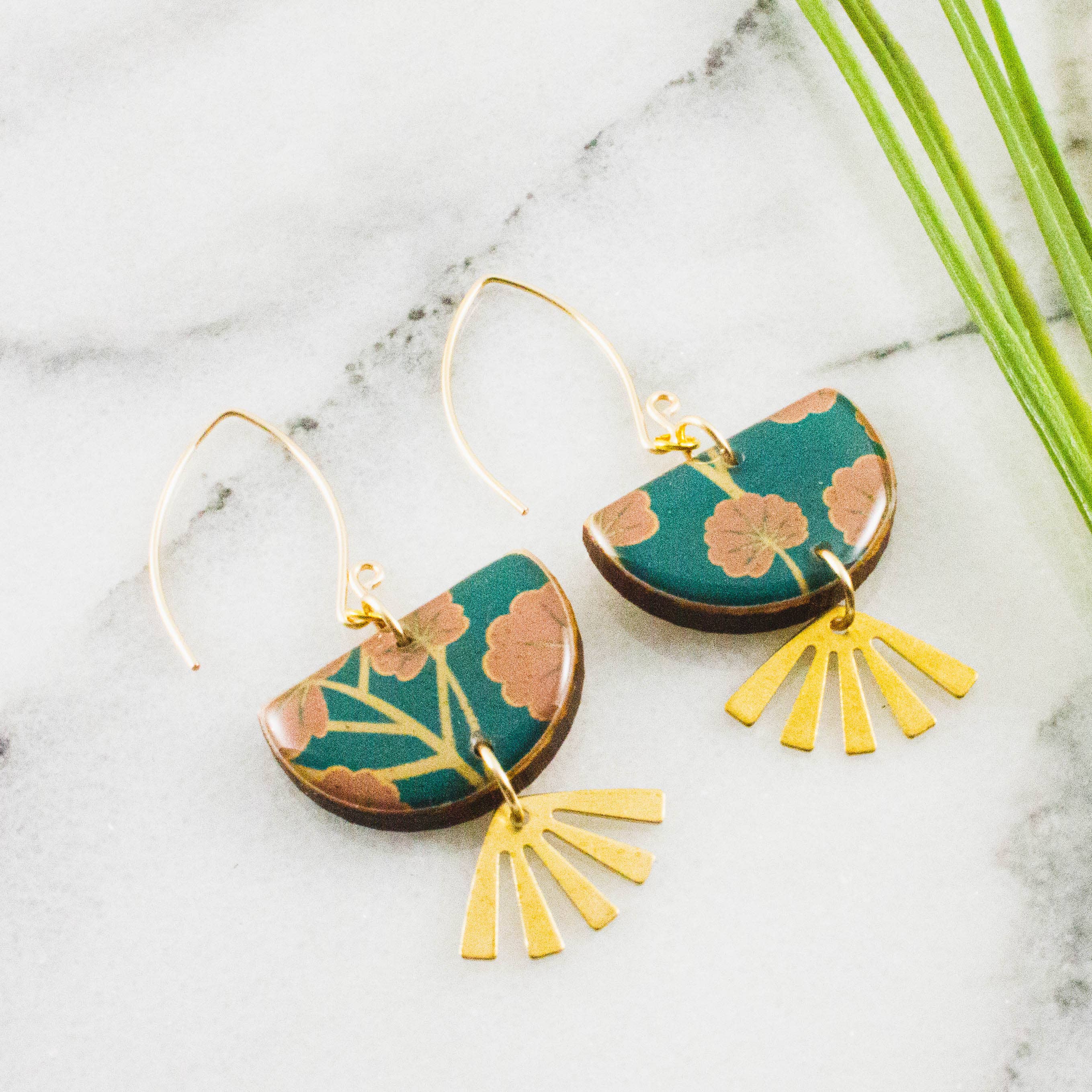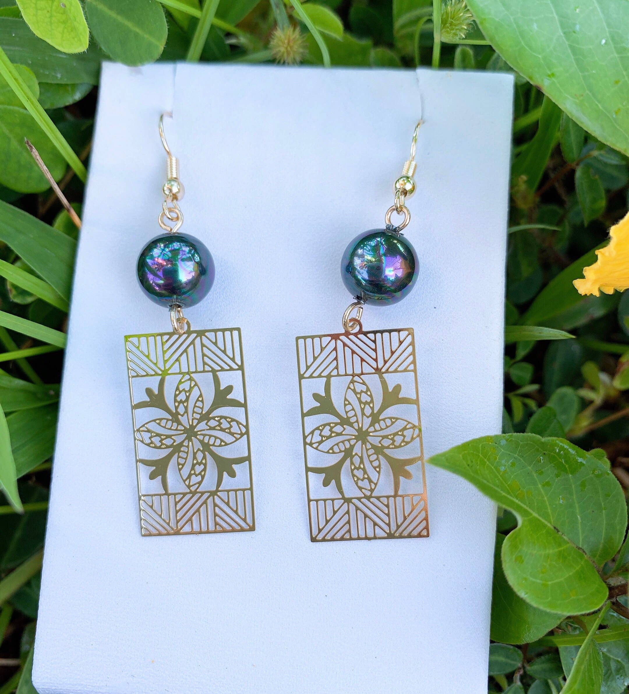 These earrings are made with a mixture of brass and gold plate findings. These patina rectangles come in 2 striking colors, and are an etched gold, starburst pattern on the colored patina background. The ear wires are gold plate. All Earrings come carded.