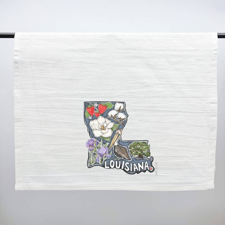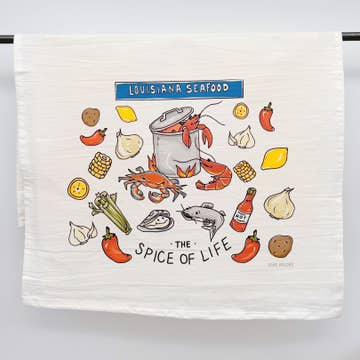 *NEW TOWELS!* We have removed the banding option on our tea towels, however the product and care information are now on a sewn-in tag! We take pride in our Louisiana seafood, including year round seafood boils and fish fry party. It's our spice of life all on a cute New Orleans inspired kitchen dish towel. These absorbent flour sack towels are 100% cotton, measuring 18" wide x 28" long and comes with a hanging loop on in the top corner. Illustrated by New Orleans Artist Kristin Malone Johnson and printed in Louisiana on a blank towel made in India. Machine wash in cold water with like colors. Use only non-chlorine bleach. Tumble dry without heat. Warm iron as needed.