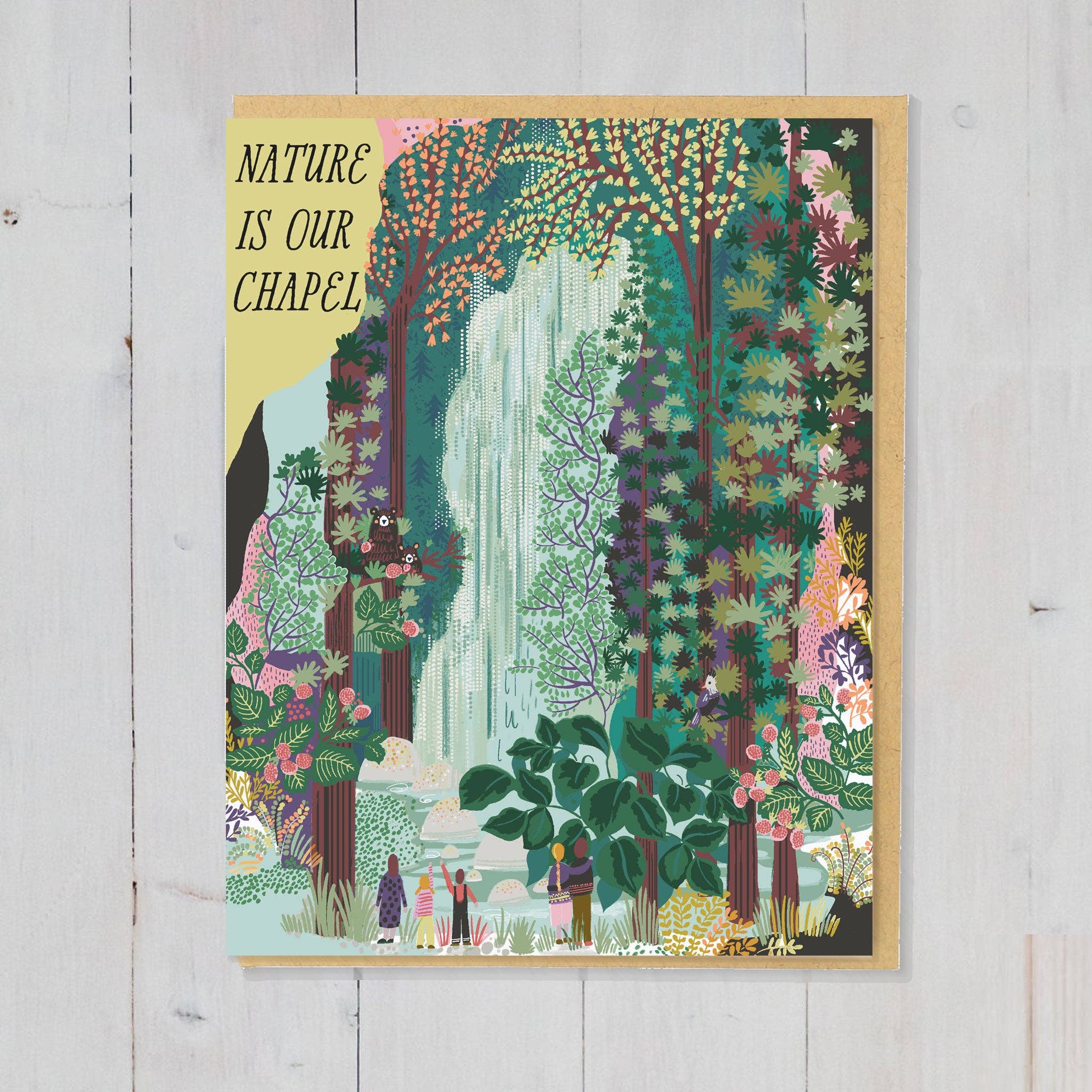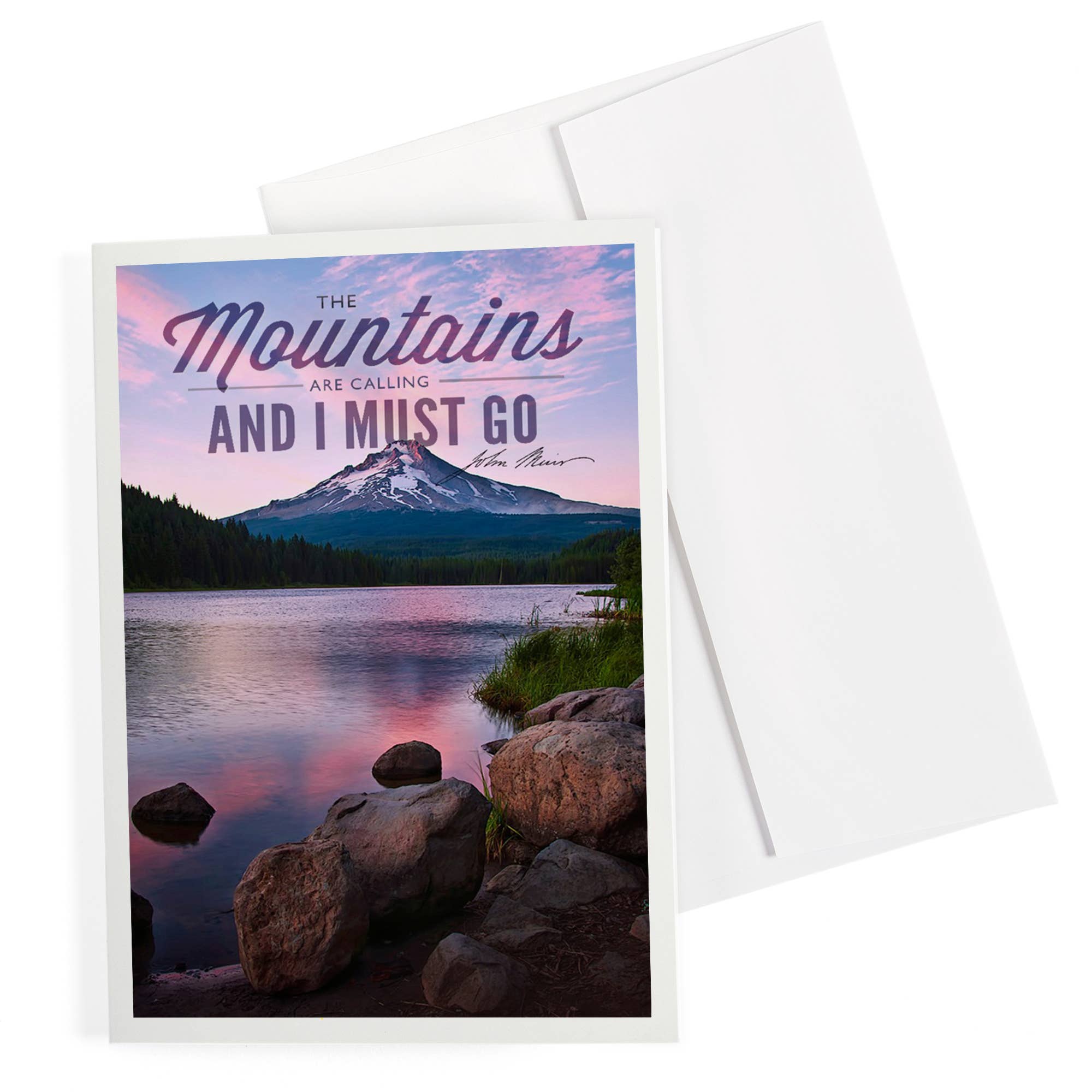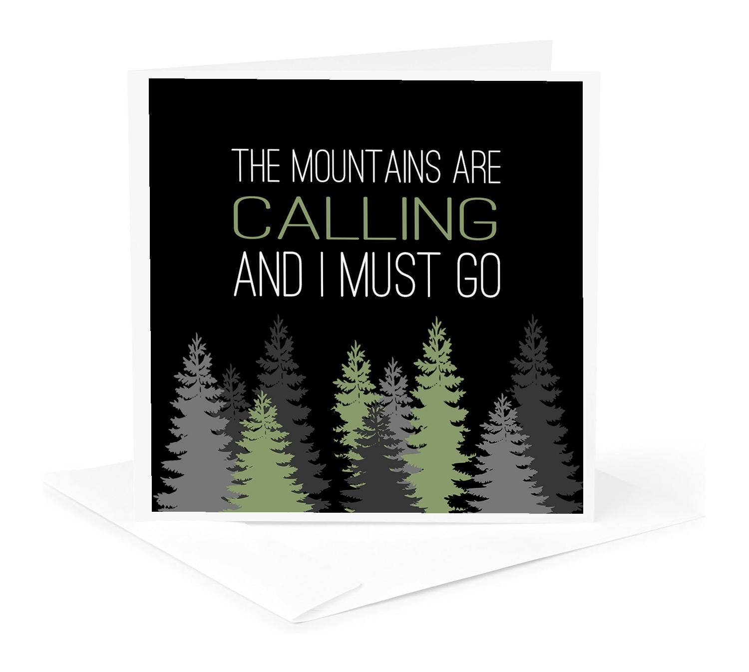 A greeting card for nature lovers! 'The mountains are calling and I must go, and I will work on while I can, studying incessantly' ~ John Muir Printed on white cardstock textured felt FSC® paper from responsible sources. Packaging: brown kraft paper envelope Made with love in Canada