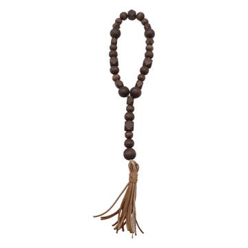 The Lagoon features all-natural stained wood beads, each piece is connected at the base by an 18k gold gilded oyster shell, and a handcrafted tassel. Each piece is finished with a piece of recycled African Sea Glass. Easily hung from a door handle to designate a particular room, directly on the wall by nail or hook, or from the corner of your favorite framed photo - you will have no trouble finding the perfect spot for this style to be displayed in your home. Bead Size: 20mm/Approx 1", Overall