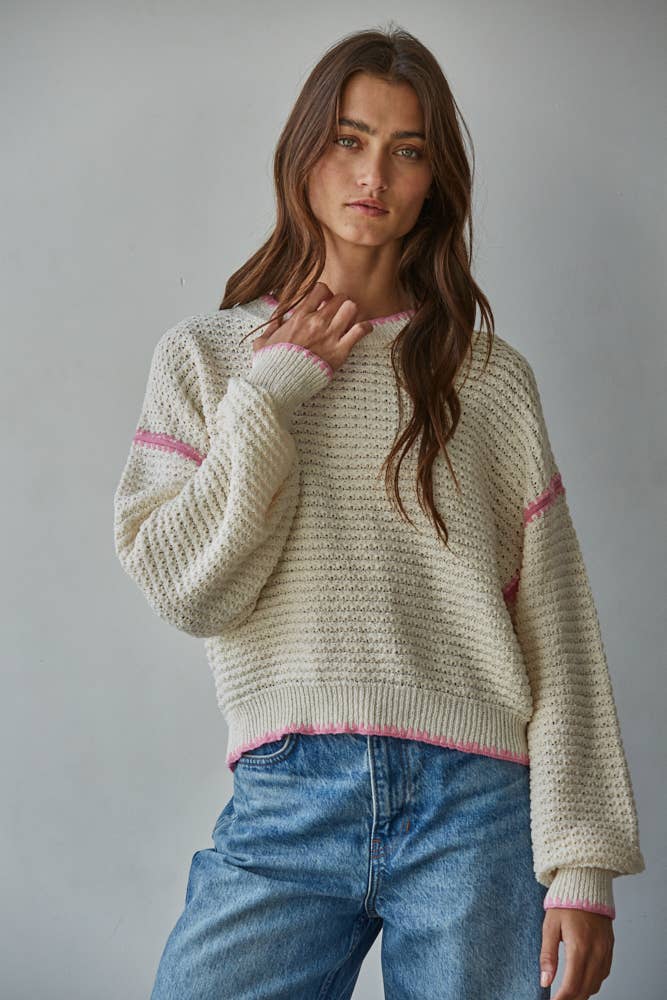 ROUND NECK LONG SLEEVE STRIPE LIGHT WEIGHT SWEATER