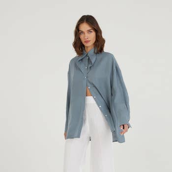 • FRENCH LINEN SHIRT • 100% EUROPEAN LINEN • HAND WASH INSIDE OUT IN COLD WATER AND HANG TO DRY • MODEL IS 5'9" WEARING SIZE S • MADE IN EUROPE LABEL: Linen Luv