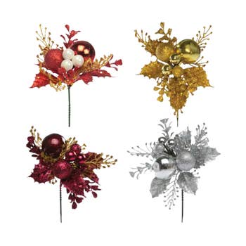 41 Piece Set of Red & White Sprays & Stems Included: 3- 24" Poinsettia Stem w/ 12" Bloom 2- 13" Velvet Holly Leaf Pick 3- 13" Peppermint Poinsettia Pick w/ 12" Bloom 2- 18" Ball Curly Pick 2- 19" Bell Spring Pick x 3 2- 24" Peppermint Curly Spray 2- 16" Glitter Peppermint Candy Pick x 5 2- 27" Peppermint Spray x 3 3- 23" Peppermint Poinsettia Stem w/ 12" Bloom 2- 29" Felt Leaves Spray x 8 2- 16" Frizzy Curly Pick x 3 2- 16" Swirl Stripe Ball Pick x 5 2- 18" Twirl Ball Pick x 5 2- 17" Velvet Stripe Ball Pick x 3 2- 16" Peppermint Curly Pick 2- 31" Peppermint Curly Spray 1- Candy Cane Bundle of 6 3- 14" Glitter Curly Spray 2- 32" Marshmallow Spray