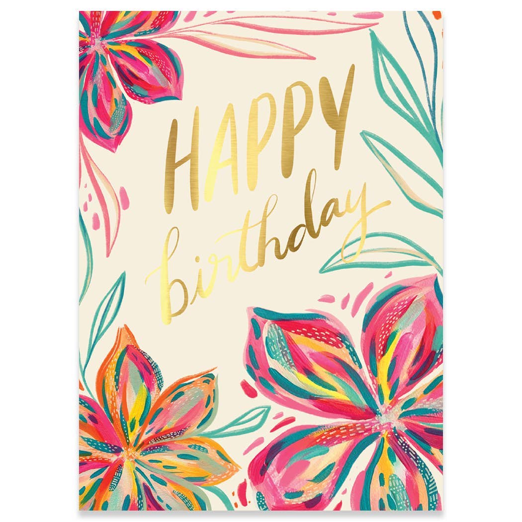 description Delightful summer flowers bloom over a pale pink backdrop. The text is a hand-lettered script that is centered on the face of the card. front greeting happy birthday inside greeting blank format 3.5 x 4.875 inches, folded (4Bar) printing offset-printed in Massachusetts paper FSC-certified cover made from 100% post-consumer waste envelope white origin USA item no. SN2401Â /Â BN2401