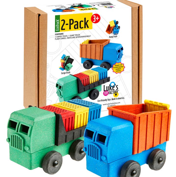 The Educational 4-pack from Luke's Toy Factory contains a full set of trucks. There's a fire truck, dump truck, cargo truck and tipper truck. The trucks are a simple 3d puzzle, with built in wiggle room so kids with developing motor skills or challenges are not frustrated. The Educational 4-pack is perfect for classrooms and playrooms alike! Made in USA using eco-friendly materials - NO paint, glue, nails or screws - Parts Mix & Match - Promotes the development of fine motor, problem solving, and creative play skills in kids 3+ - Sustainable packaging made of recycled cardboard.