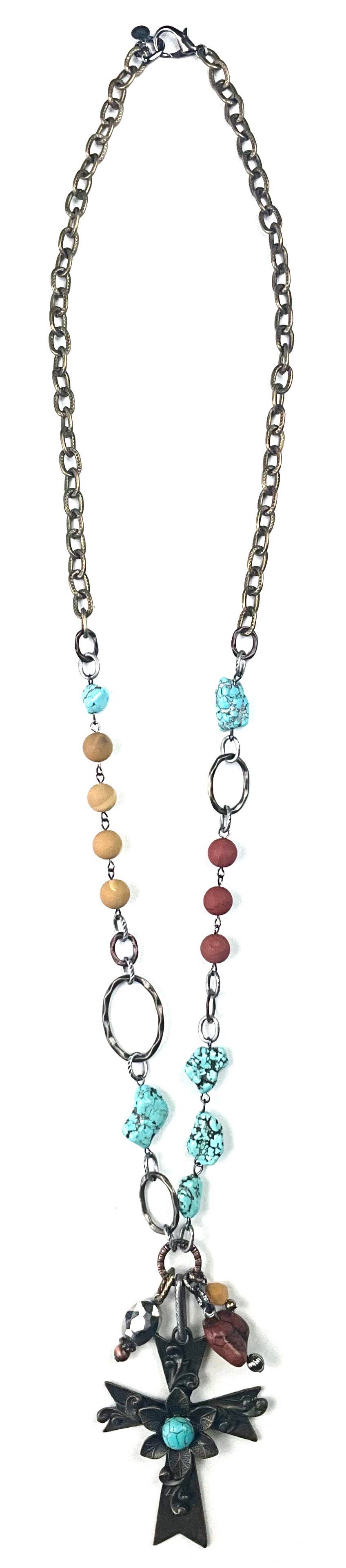 Gypsy Junk Original-Pink 24” length necklace These Gypsy Junk necklaces are unique and full of personality. We offer several color schemes with many different charms and trinkets. It is like hidden treasures that you wear. Each one is unique to your personality or how you want to express yourself for the day. Never wear dull jewelry. You will be stopped and asked about this wearable piece of art. These sell out at any market we attend. This color palette is all shades of pinks and iridescent crystals Aqua and Turquoise The crowning jewel is the Fuchsia Agate. . So many trinkets and treasures. Butterflies, love charm, flowers, and assorted handmade beaded charms and handmade beaded chain. These are designed and handcrafted by the owner and the artisan in our studio.