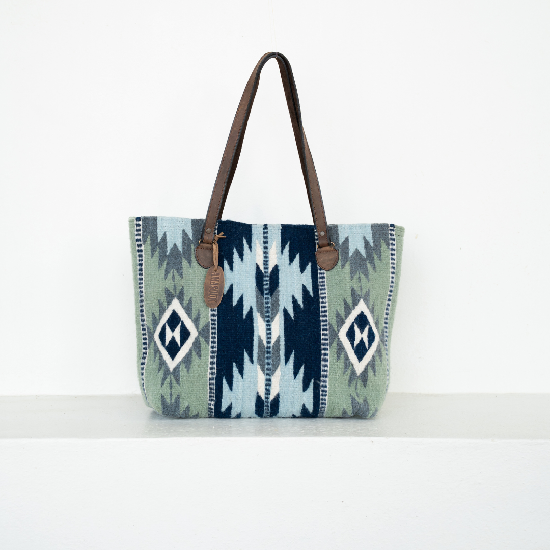 Made in Mexico Bag Size: Mini Color: Brown and Green Fabric: Wool, Leather Occasion Theme: Everyday Pattern: Aztec Packaging: Plastic-free Production: Ethically sourced and Fair trade