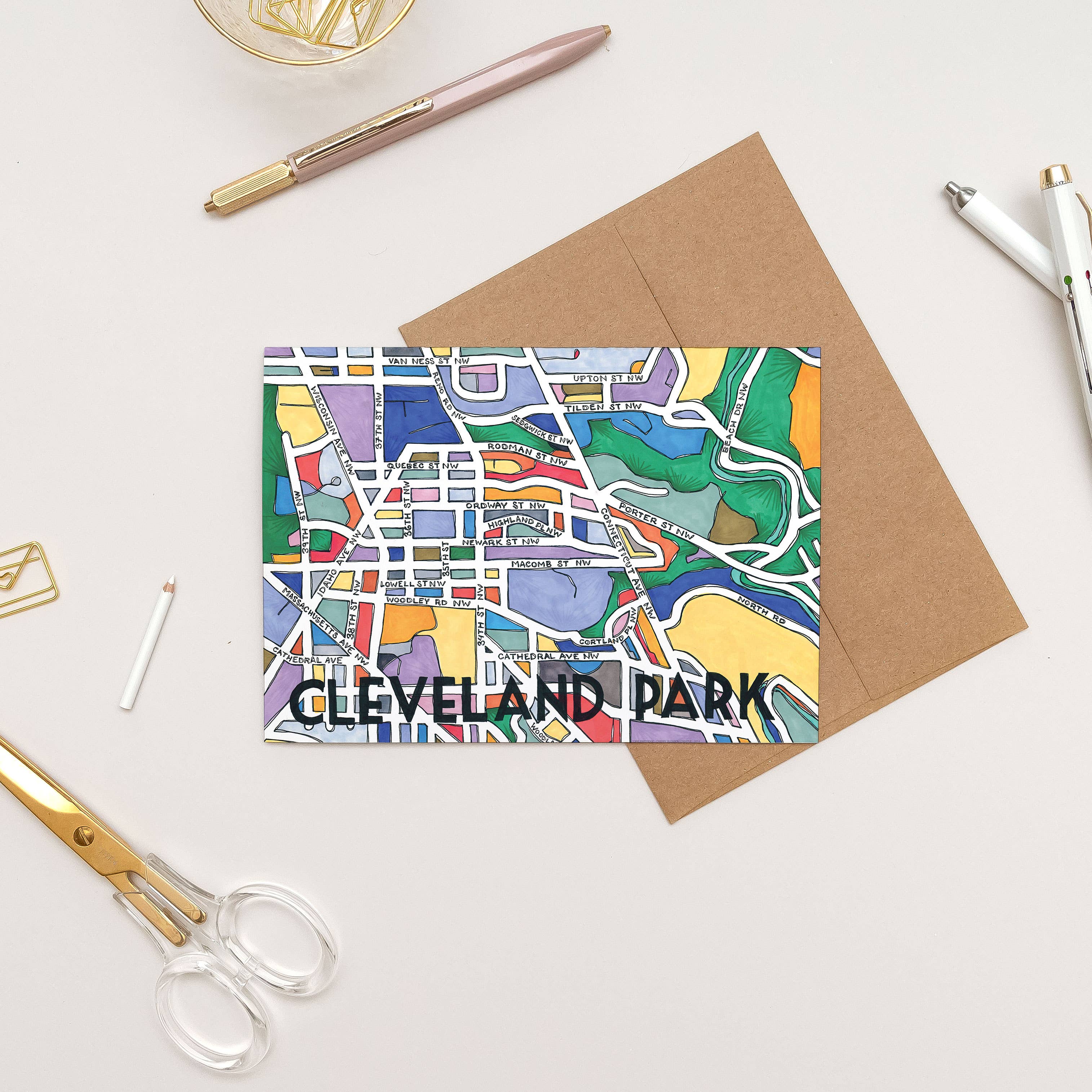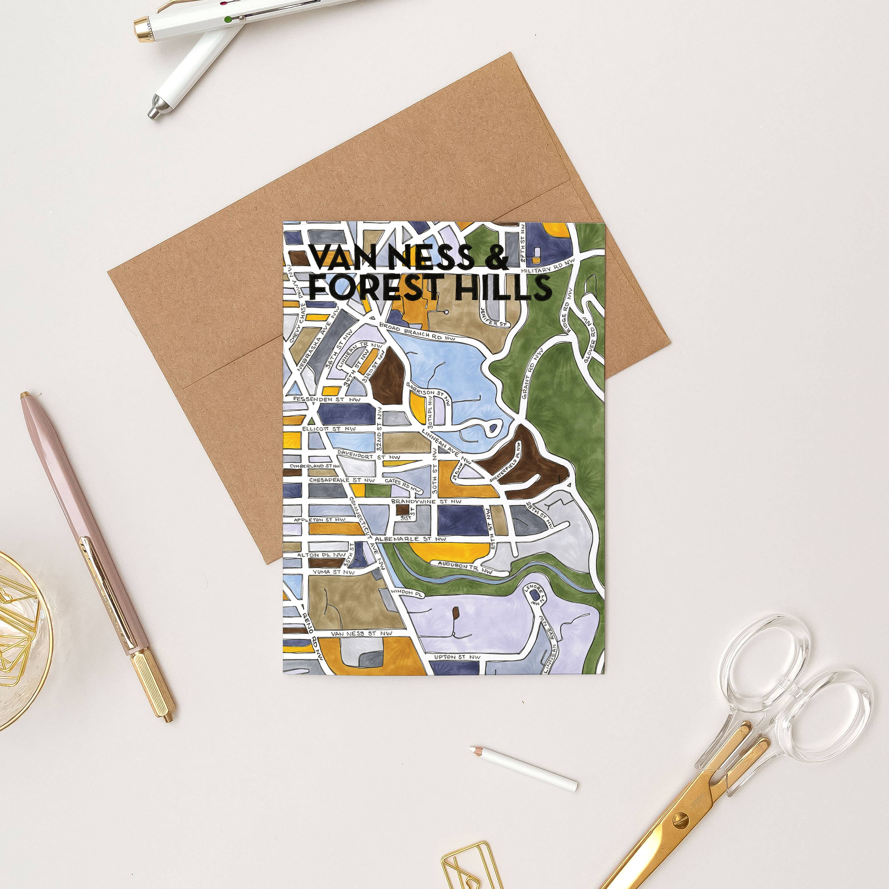 Meet the Chevy Chase DC Neighborhood Map greeting card! Our greeting cards are 5x7” so they can be mailed or easily framed as a mini-print. Each greeting card is packaged in a crystal clear poly sleeve with a kraft paper envelope. This hand-illustrated map includes all the streets in the neighborhood, as well as local parks in a vibrant green. We’re excited to help you celebrate all the places you call home with this colorful map greeting card! As part of our commitment to the planet, our maps are printed in EcoSilk paper using soy-based inks for minimal environmental impact. Our maps are locally printed in Washington, DC with vibrant, saturated colors, and high quality papers and inks to make sure the colors won’t fade over time.