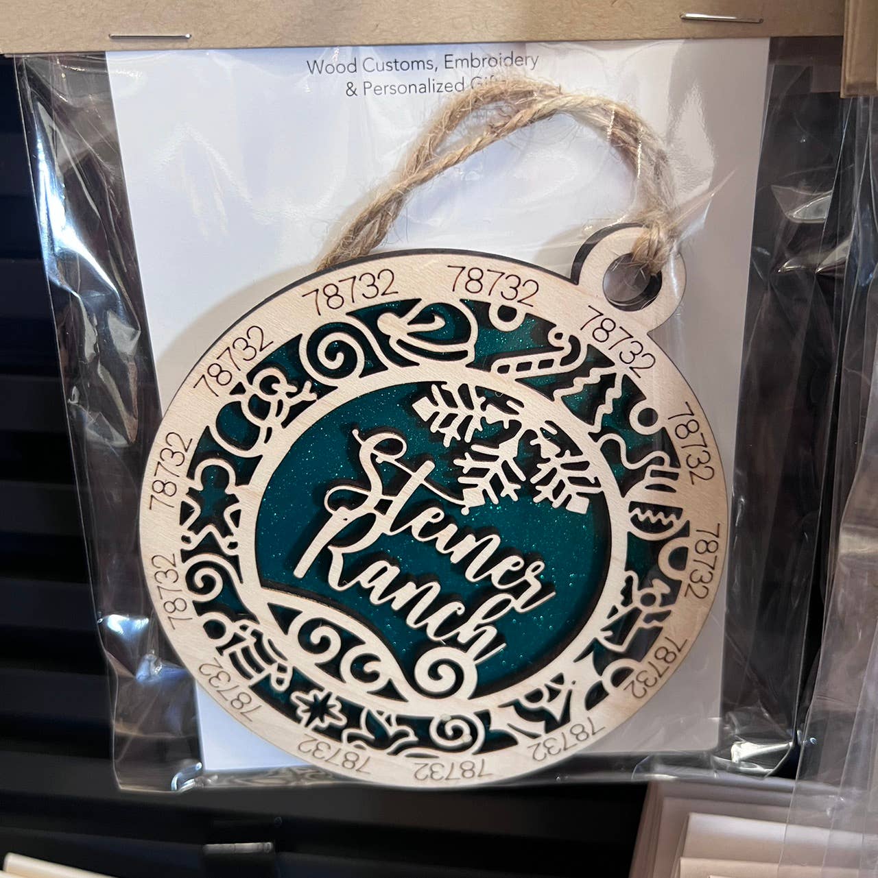 Would your visitors love a town ornament? We can make them for your individual towns. Includes main Zip code, and town name. Backing are multiple glitter colors. If you have a specific color for your town, please contact me. We can do most any colors. These are an exclusive design. They won't be found anywhere else. We also will not sell to another boutique/store in your zip code. 4” wide double layer wood ornament Double layer, wood product, laser cut. Individually hand assembled.