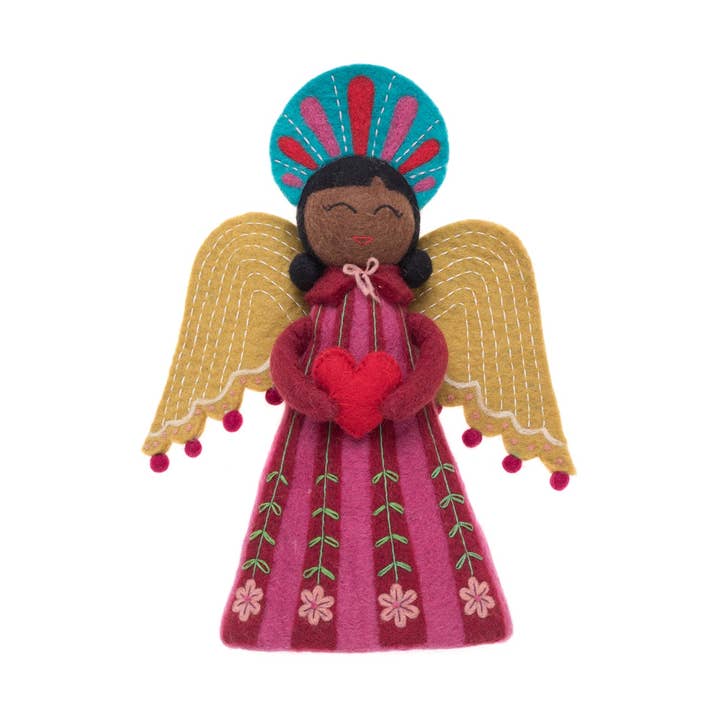 Can you think of anything cuter on your tree than this beautiful angel tree topper? Us either. Hand-felted with beautiful embroidery. 15" tall. Handcrafted in Nepal.