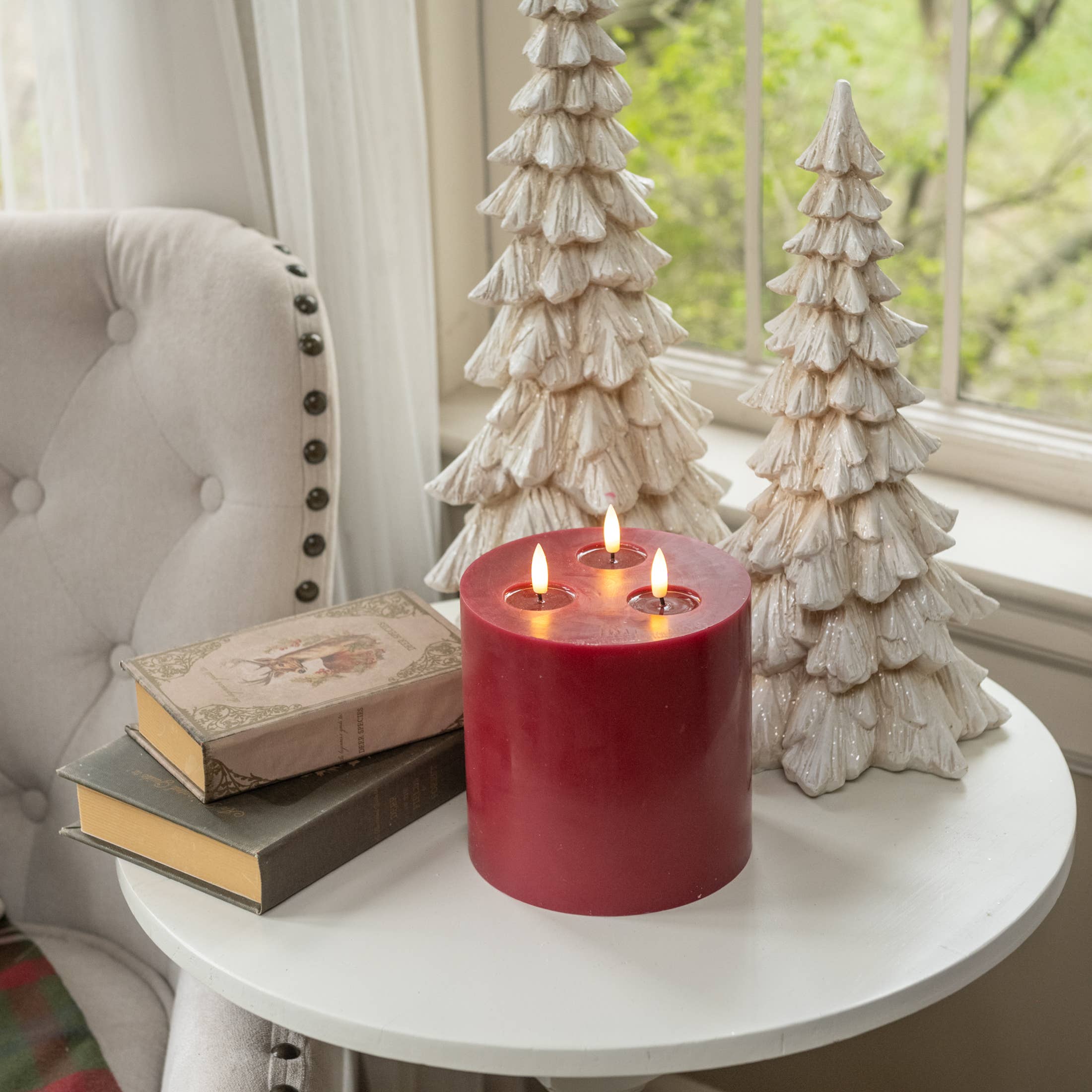 Create a warm, inviting atmosphere with our LED candles with three realistic flickering wicks. These flameless candles are safer than open flames, making them an all-season best-seller. Sizes: small (6" x 6"), medium (6" x 10"), and large (6" x 12") Colors: cream, burgundy, and mustard Power: runs on 3 AA batteries (not included) Switch settings: ON, OFF, and 6-Hour Timer- turns off automatically after 6 hours