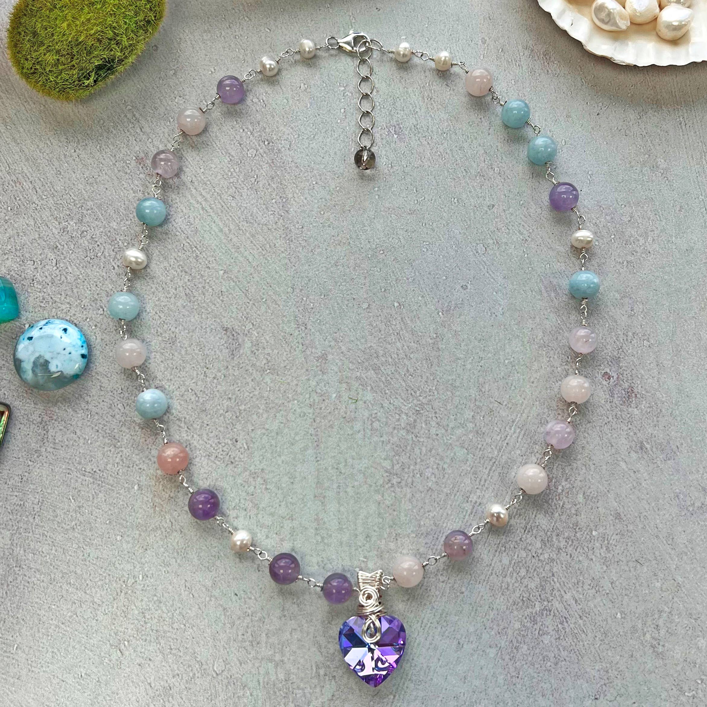 3 Meaningful Stones to bring together Peace & Love Pink Tourmaline- Creativity and Abundance Rose Quartz- Peace and love Amethyst- Peace and Harmony Our cluster necklace is on Sterling Silver chain. 18" in length.