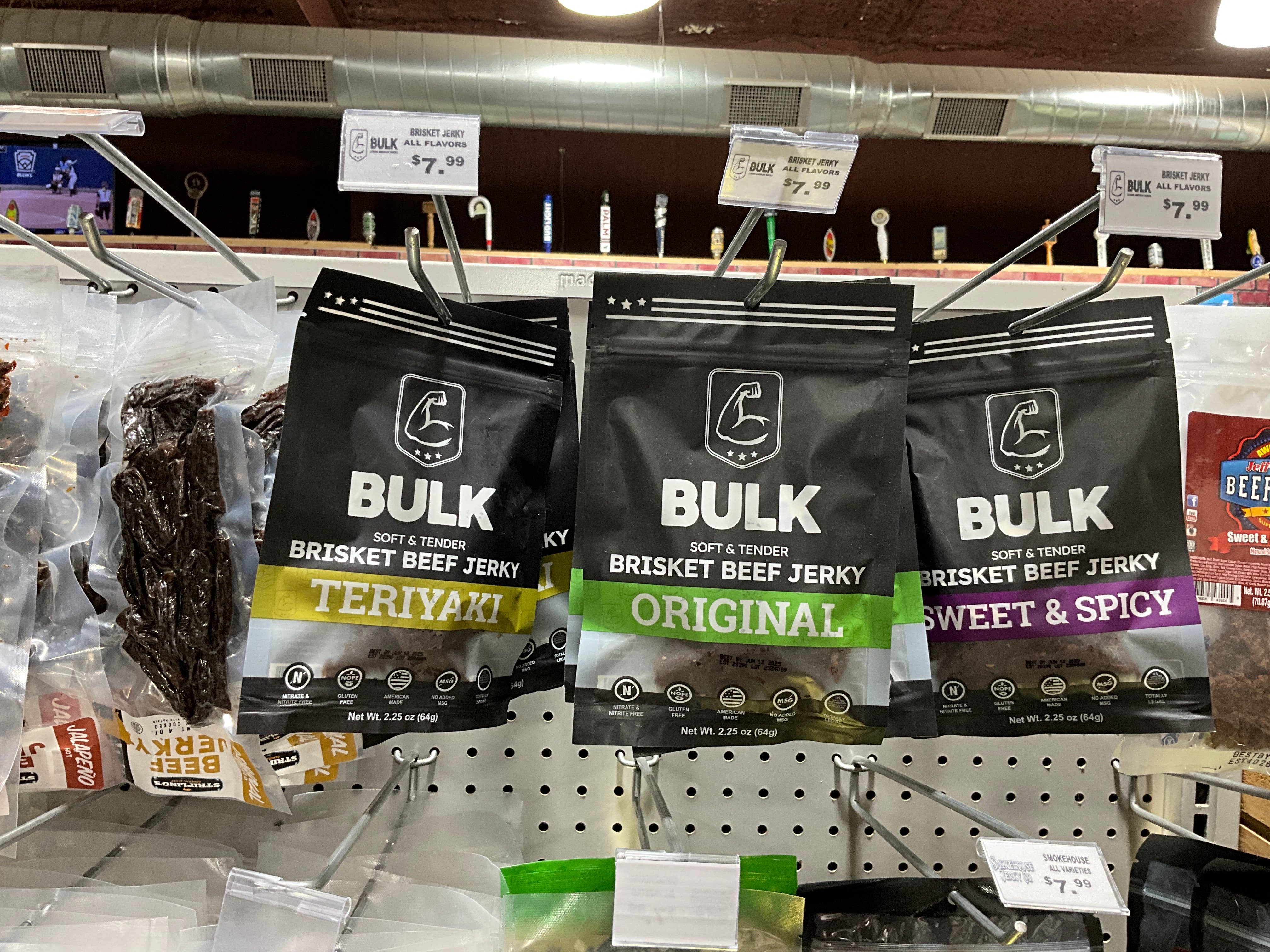 All-natural Brisket Beef Jerky - Bulk’s best selling jerky line. Super soft and tender, melts in your mouth. Made with brisket cut and is naturally a more marbled tender jerky style. - American Made - No Nitrates - No MSG - Gluten-Free Reduced sodium product. Size: 2.25 oz, 7 oz, 1 lb, and 5 lb (typically for deli-style sales). Care instruction: Refrigerate after opening. Shelf stable 12 months.