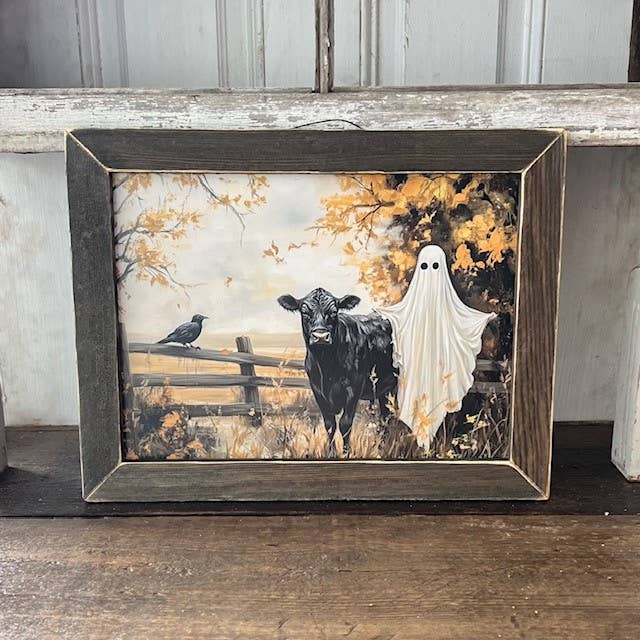 Add a dash of humor and Halloween fun to your home with this playful art print featuring the phrase in dark brown and orange block font. Three dancing cows, each covered in white sheets and holding bright orange pumpkin bags, with one sporting a witch's hat. Fluttering bats add to the festive atmosphere in the background. Perfect for a living room. • Printed with vivid colored inks on cotton canvas mounted on wood • Solid hardwood frame in shown stain colors • Sustainable American sourced wood • Made in the USA in our Utah studio • MINI 6" tall x 6" wide x 1.25" deep w/ 1/4" thick frame • SMALL 11" tall x 11" wide x 1.25" deep w/ 1/4" thick frame • MEDIUM 15" tall x 15" tall x 1.5" deep w/ 3/4" thick frame • LARGE 22" tall x 22" tall x 1.5" deep w/ 3/4" thick frame • Signs may have +/-1" variations • All signs can stand on a shelf or table (Medium & Large can also hang on a wall) • Farmhouse style frames have small rustic imperfections that make them unique