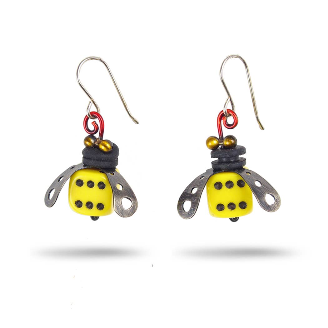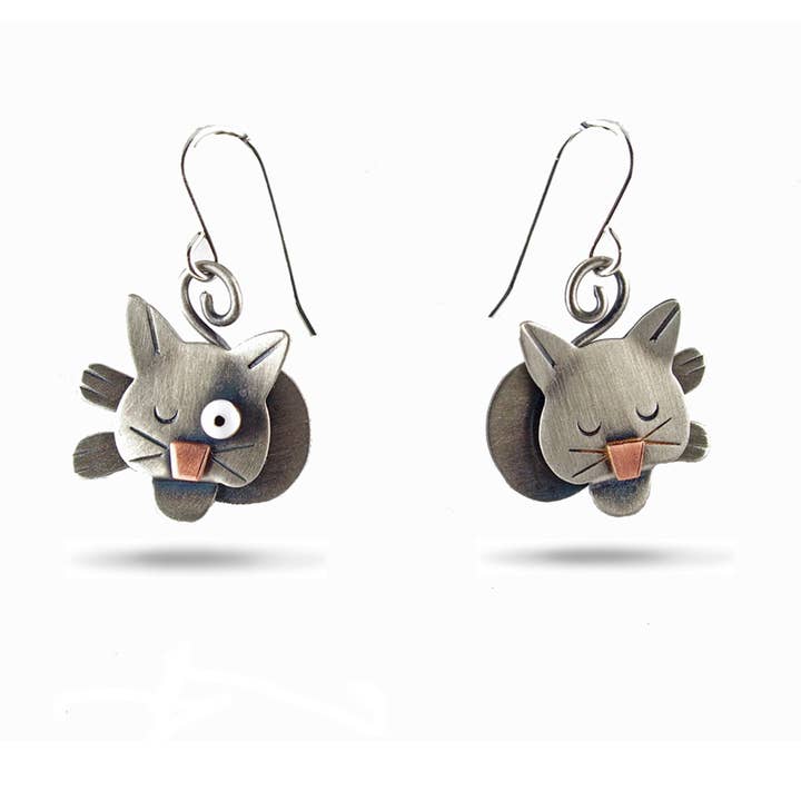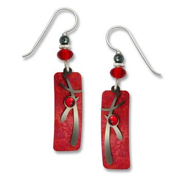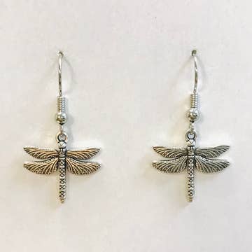 A clever play on words, these little dragonflies are built around 2 brass wood screws. With nickel silver for their wings and kinetic brass bead eyes on stalks, red and blue enamel painted accents and gold leaf, these are sure to be conversation starters. Fabricated and silver soldered with gold-filled ear wires. About 1" tall.