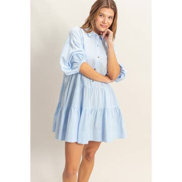 - Collared Button Down Long Sleeve Mini Dress - This chambray shirt dress features a point collar, a full button front closure, long sleeves with buttoned cuffs, two side hip pockets, a curved hemline with side slits, and layered frayed edge ruffle detailing across the chest and back for a playful yet polished silhouette. - Model is 5'8" and wearing a small. - 55% COTTON, 35% TENCEL