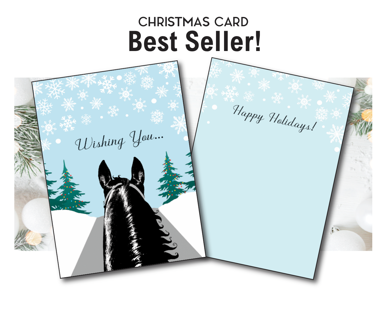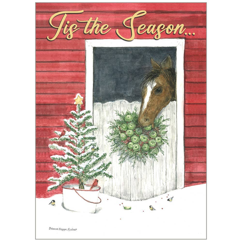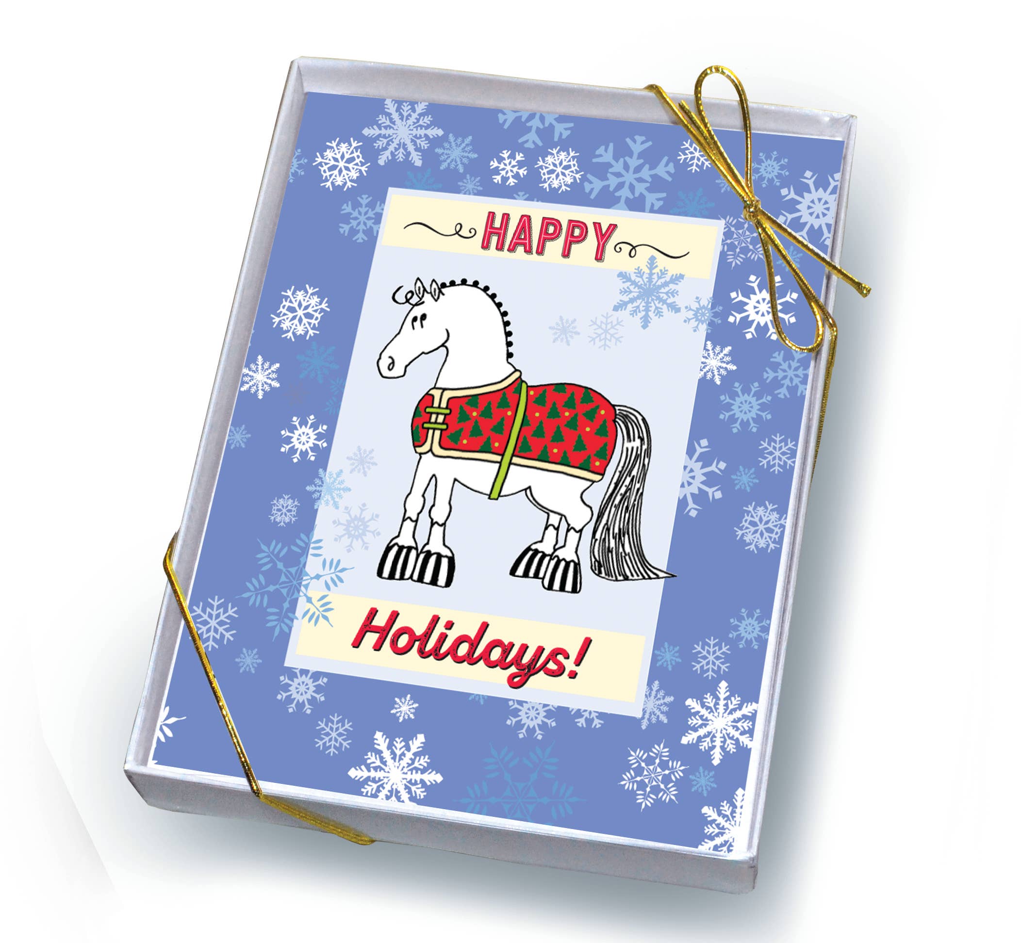 BEST SELLING, Inexpensive and affordable, pretty and artistic horse and equestrian BOXED Christmas cards. Box includes envelope: 8 cards, 8 high quality envelopes. Crafted from quality paper with a high-gloss UV coating and printed in the USA. 6" x 4.5" inches with woven envelope opens to 9" x 6". Box has UPC and a gold label describing what’s written inside the cards. Gold strings holds the box closed. Boxed Horse Christmas Cards: • Each box contains 8 cards and 8 white wove envelopes. • The Back of each box has a gold sticker label with what’s inside the card and a UPC bar code • Gold stretchy ribbon holds box closed Artist and creator, no AI (no artificial intelligence). Everything starts in my head, then to a drawing board and then to the computer to set up for the printer. Holiday Greeting cards: • High-quality card stock with a high-gloss UV coating • 4.5 x 6 opens to 9 x 6 • Inside uncoated for writing • Matte white envelope • Inexpensive - customers buy more than 1 • Sleeved in plastic / UPC bar coded • USA & American brand • Ships from US, no import duties • No tariffs • No AI (no artificial intelligence) • 52% margin • FREE Shipping ~ ALWAYS (we've never charged shipping: 35 years of biz) :-D • LOW Minimums • 35 Years serving retailers • FREE Sample Pack with each order* "We sold your Christmas cards like crazy!!! None left and we bought a lot!" Rosemary, Equus NOW, OH "5 stars across the board! They shipped quickly and the order was very well packaged."-Ashley, Northwest Tack *Each order gets a FREE sample pack of things to try. Google doc of UPCs and ret: $6-8