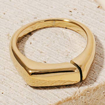 Snash Jewelry nameplate rings are available in sizes 5-9. Brass rings are uncoated, allowing for customer re-polishing. Avoiding water, heavy lotions, chlorine, etc., will prolong the original polished shine. Cleaning the ring with a jewelry polishing cloth will restore shine if tarnish occurs.