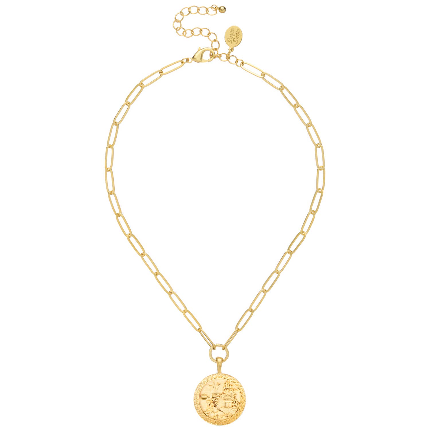 The Lora Coin Necklace is our number 1 best seller. Comprised of an elegant paperclip chain with alternating roped and smooth links. It features a small coin replica. Measurement: 16" long, adjustable Materials: -14kt gold filled lobster claw and cable chain ending -24kt gold overlay textured paperclip chain -24kt gold plate coin (16mm) Our 24kt Gold Overlay jewelry is crafted using a high-quality brass base coated with an advanced acid gold electro-depositing process, applying 20-30 microns of 24kt gold. This technique produces a durable and long-lasting finish, far superior to basic decorative gold-plated costume jewelry, which typically features 5-7 times less gold. Acid gold plating, originally developed for the electronics industry, offers excellent wear resistance and makes our Gold Overlay jewelry a reliable alternative to solid 14kt gold. This option provides a luxurious look and feel without the high cost of solid gold. For most people, Gold Overlay jewelry is a fantastic, long-lasting choice. However, if you tend to experience issues with gold plating changing color quickly, we recommend considering solid gold-filled or sterling silver options for even greater longevity. SKU: CN1356 For more material information click here