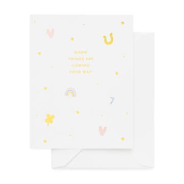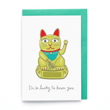 Featuring a Chinese lucky cat and the caption 'I'm so lucky to know you', this card is a great all rounder. Perfect to say thank you, I'm thinking of you, you're great! Lucky Cat Card Features: Size: 105mm x 150mm Supplied with turquoise envelope Blank inside 300gsm star-fine white paper FSC-certified acid-free card stock Hand drawn and printed in the UK Packaging options: cello, klasp, or nested. Sold in case of six