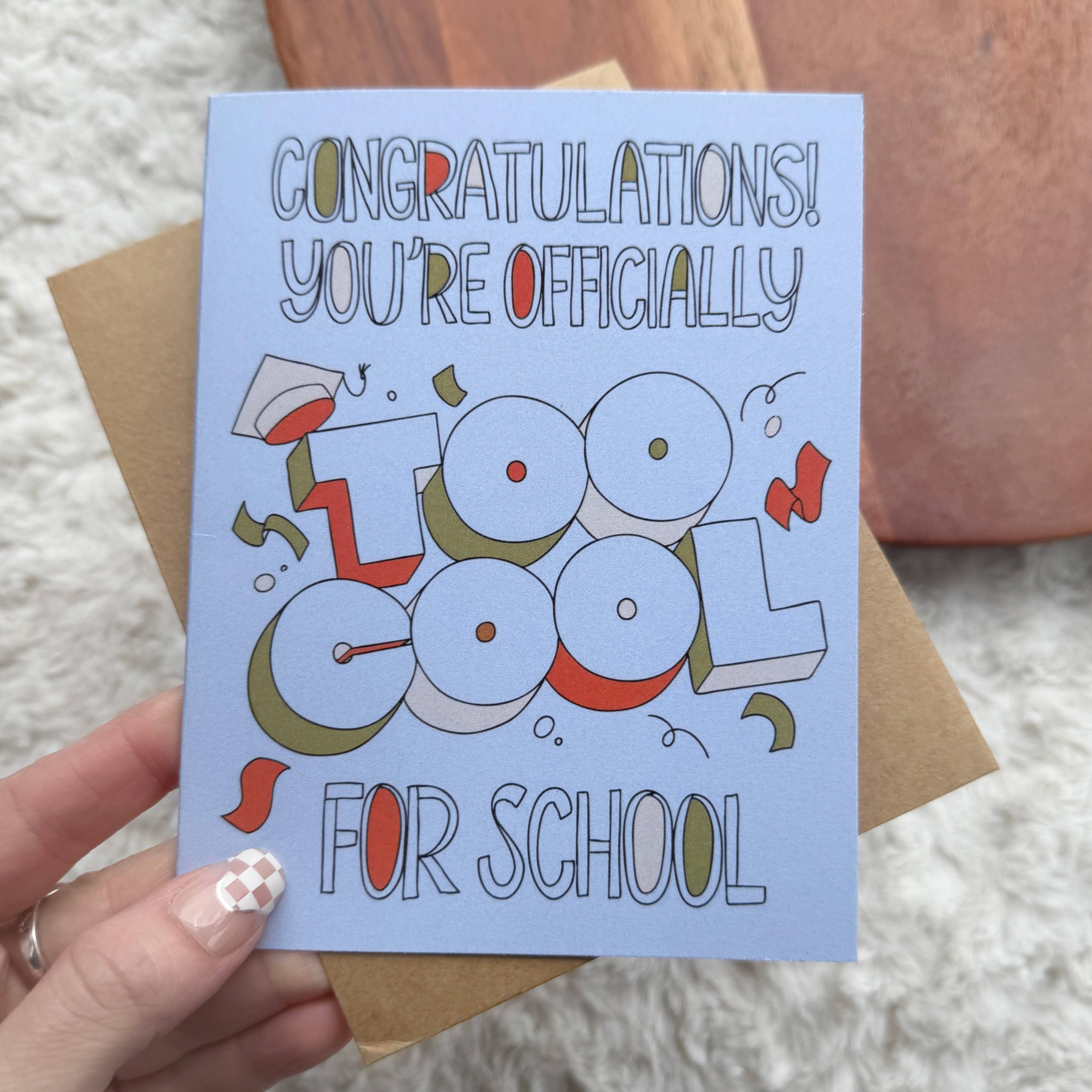 I said this so much growing up - what do you think, you're too cool for school!? Now the grad really is! Designed and printed by hand in our Colorado studio on a circa 1947 printing press. Specifics: 118lb cotton, tree-free paper, euro-flap envelope, letterpress printed on a vintage printing press, blank Inside, packaged in clear poly sleeve Letterpress Greeting Card, Retro Greeting Cards, Mid-Century Greeting Card, Letterpress Graduation Card, Congratulations