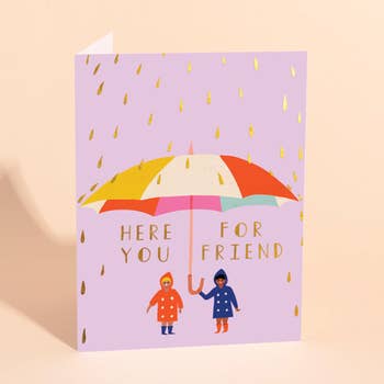 Alexa, play “Umbrella” by Rihanna. This empathy card is letterpress printed on a vintage Windmill press in Raleigh, NC. Each card is 100% cotton paper, blank inside, includes a kraft envelope and cello sleeve. A2 size (4.25" x 5.5") Black and Blue