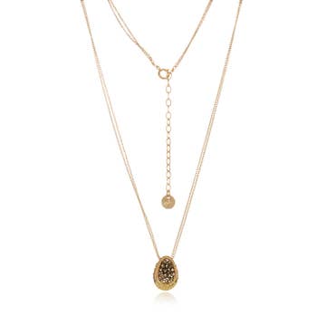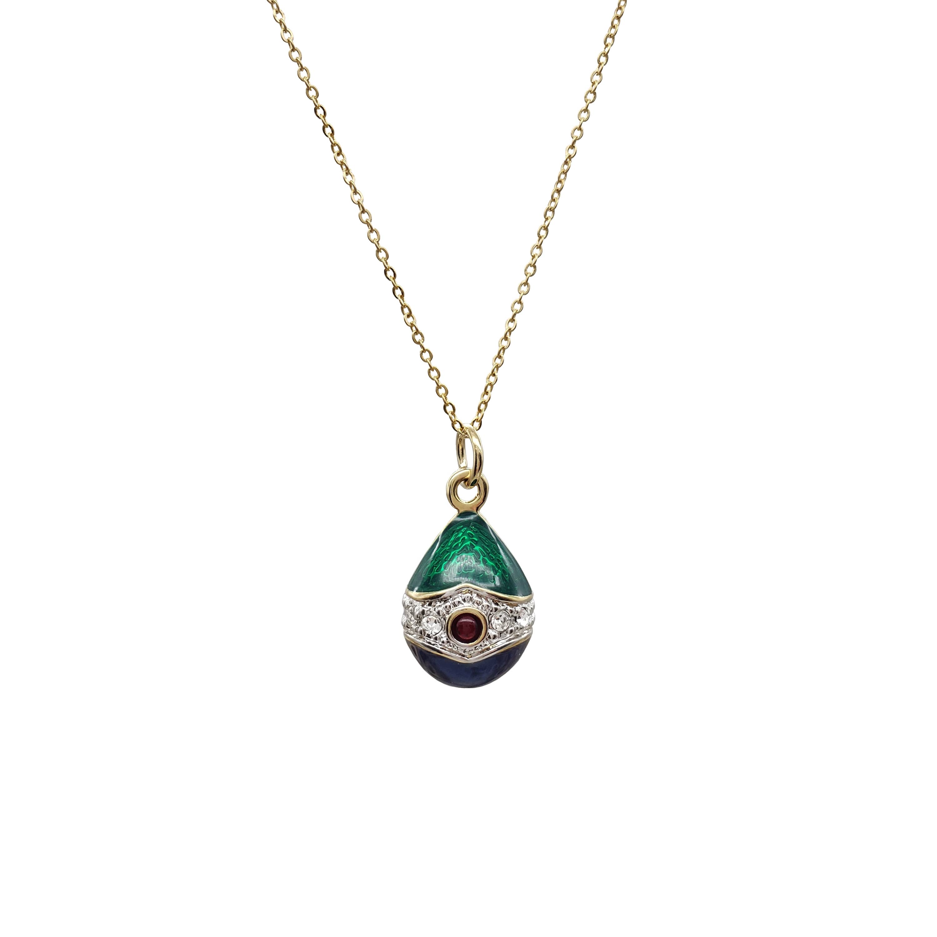 Imperial court jeweler Carl Faberge and his craftsmen created magnificent eggs of various designs not only for Russian nobility, but also for European dignitaries and the Faberge shops. In 1886 the House of Faberge was granted an annual commission by Czar Alexander III to produce eggs for the Imperial family. These imaginatively designed eggs were meticulously crafted in gold and silver with enamel, precious gems, and semiprecious stones. Our richly colored miniature eggs are inspired by these creations. Materials: pewter with gold finish, clear crystals and epoxy. Chain Length 18", spring ring closure.
