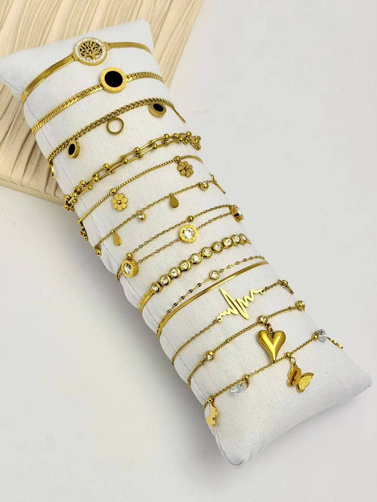 Offer a refined sparkle with this set of 12 gold bracelets in various designs. Some models are delicately adorned with mother-of-pearl or sparkling crystals for a chic and trendy touch. Presented on an elegant cushion included, they will enhance your display and attract customers looking for luminous jewelry. Made of stainless steel, nickel-free, lead-free, and cadmium-free.