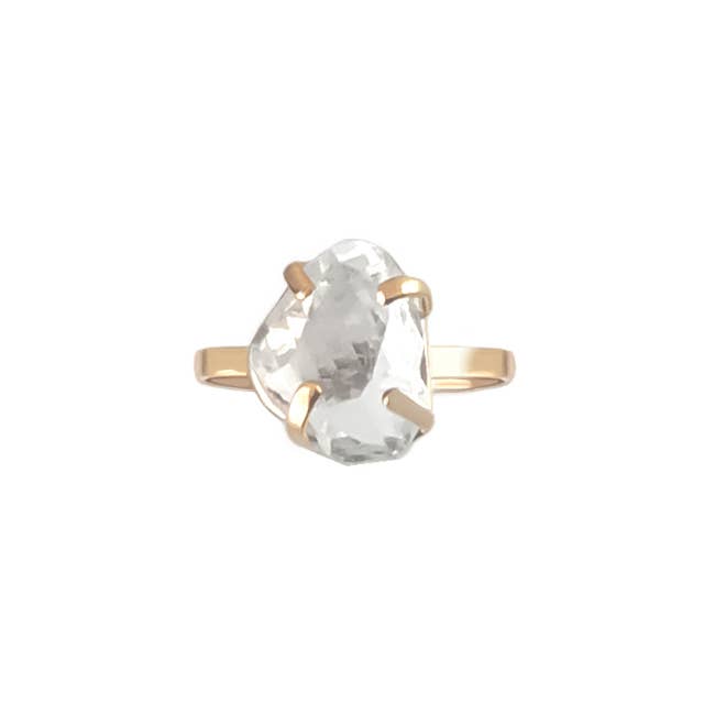A clear Utah topaz is used as the centerpiece for this 16 gauge ring. All copper has been repurposed and reformed into a wearable work of art! Our jewelry is unique and one-of-a-kind. Please note there will likely be variances in the size, shape and color of each stone. All elements of your piece are handcrafted in our tiny studio on the island of Martha’s Vineyard. We sell our packaging! Find it here: https://www.faire.com/product/p_8os914jvdz