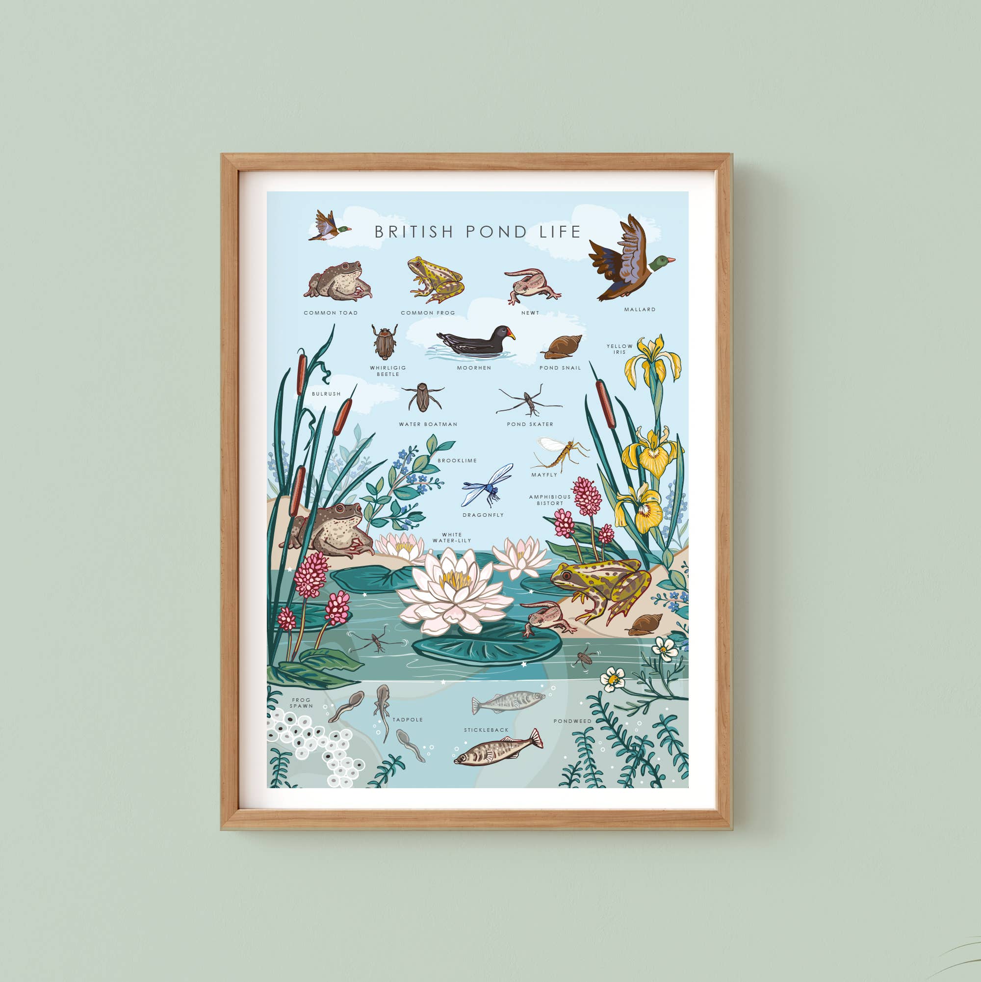 Unframed wall art print available in two sizes: A4 size - 297x210mm - printed with archival inks onto 190gsm matte archival paper and presented artist signed in a compostable cello with grey board backing card. Featuring British nature guide illustration of Garden Birds by Angie Spurgeon