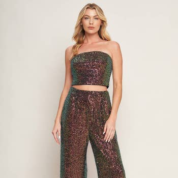 SKU: SET1894, SET1894, SET1894 Made in China Aesthetic: Glam and Preppy Embellishment: Sequined Fit: Contemporary and Junior Occasion: Formal and Holiday Pant Style: Skinny Rise Style: High Season: Core Sleeve Length: Sleeveless