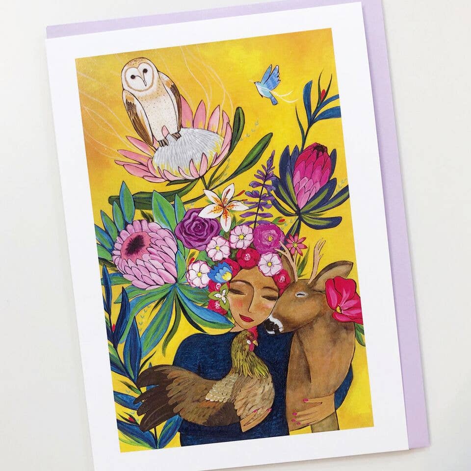 Single card with cream envelope. Measures 5" x 7" folded, blank inside for your own message. Printed on FSC certified paper, envelope 100% recycled, "plastic" sleeve is compostable.