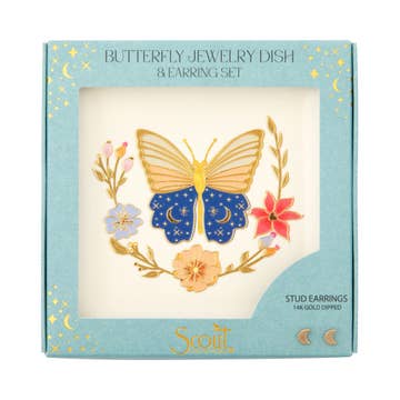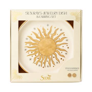 Charm meets functionality! Perfectly packaged to make a great gift for you or someone special. Each dish features celestial or botanical designs paired with classic stud earrings. •Set includes a ceramic jewelry dish & a pair of 14K gold dipped earrings. •Earrings are 14K gold plated brass. Nickel and cadmium free. Hypoallergenic. •Dish Dimensions: 3.5” x 3.5” •Not for food use. Food consumed from this vessel may be harmful.