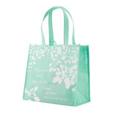 Our Eco Tote reusable shopping bags measure 12.5’’ x 6’’ x 12’’ and feature Scripture verse. Bags fold flat, can hold up to 20 pounds & have a small loop for hanging. Perfect for groceries, Bible study or as an everyday bag! Reusable shopping bags. Holds up to 20 lbs. Dimensions: 12. 5" x 6" x 12". Small loop for hanging. Features scripture verse Proverbs 3:18. Material: Nylon.