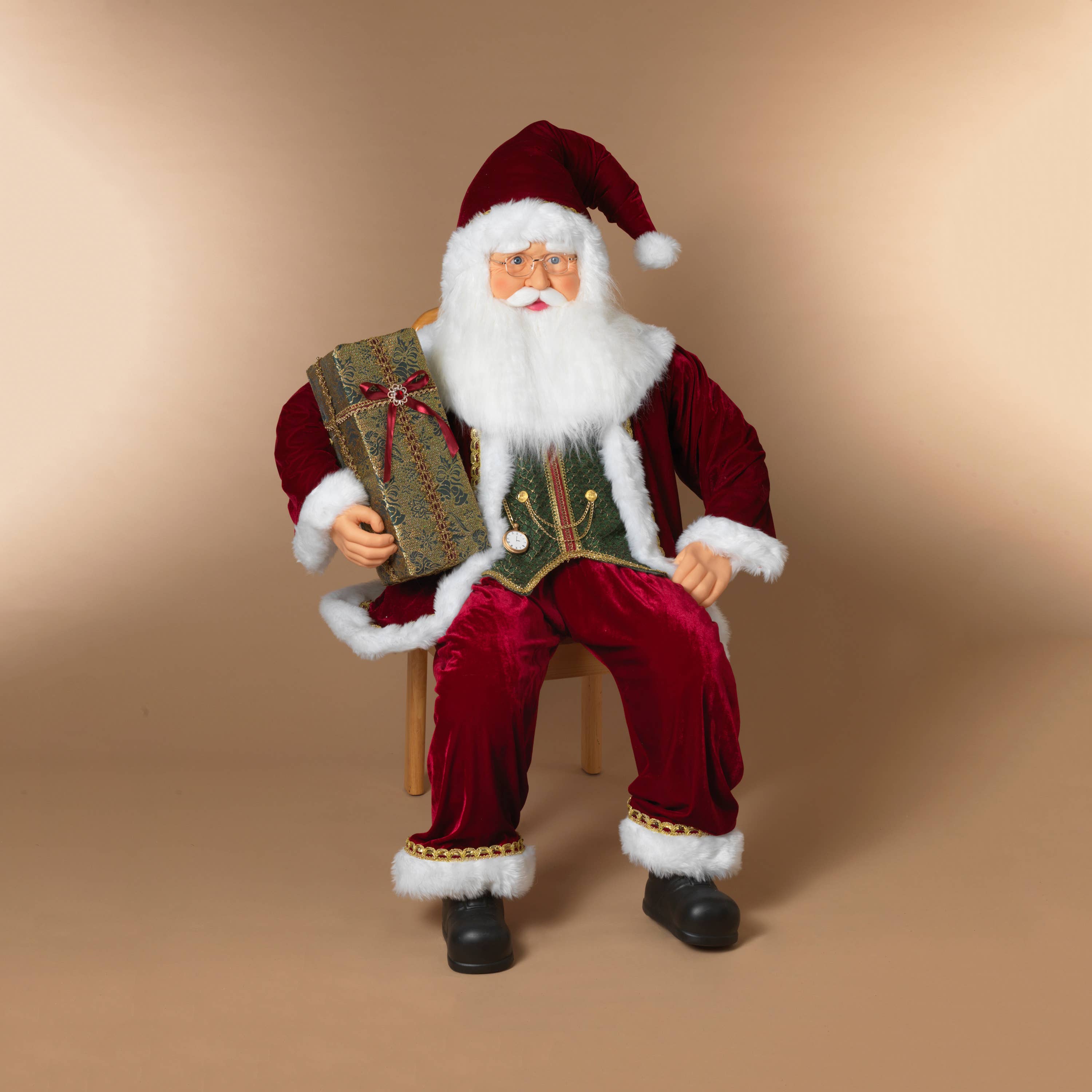 This 12" Black Santa is adorable. He is dressed in traditional red velvet with white faux fur trim. In his one hand he is holding a list of boys and girls names. Over his shoulder he is holding a sack which contains a teddy bear, toy drum and Christmas tree.