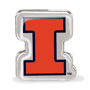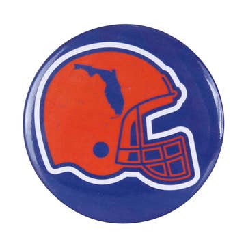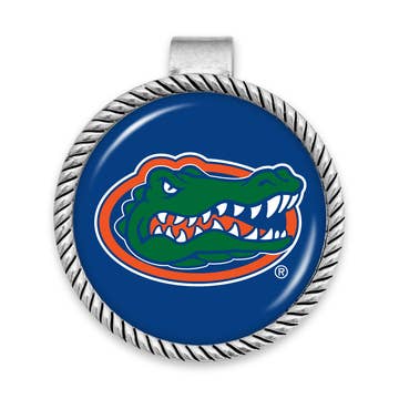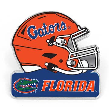 Silver plated pin featuring blue and orange enamel and the “Go Gators” slogan. Pin measures approximately 2.75" in width and 2” in height. This is an officially licensed product.