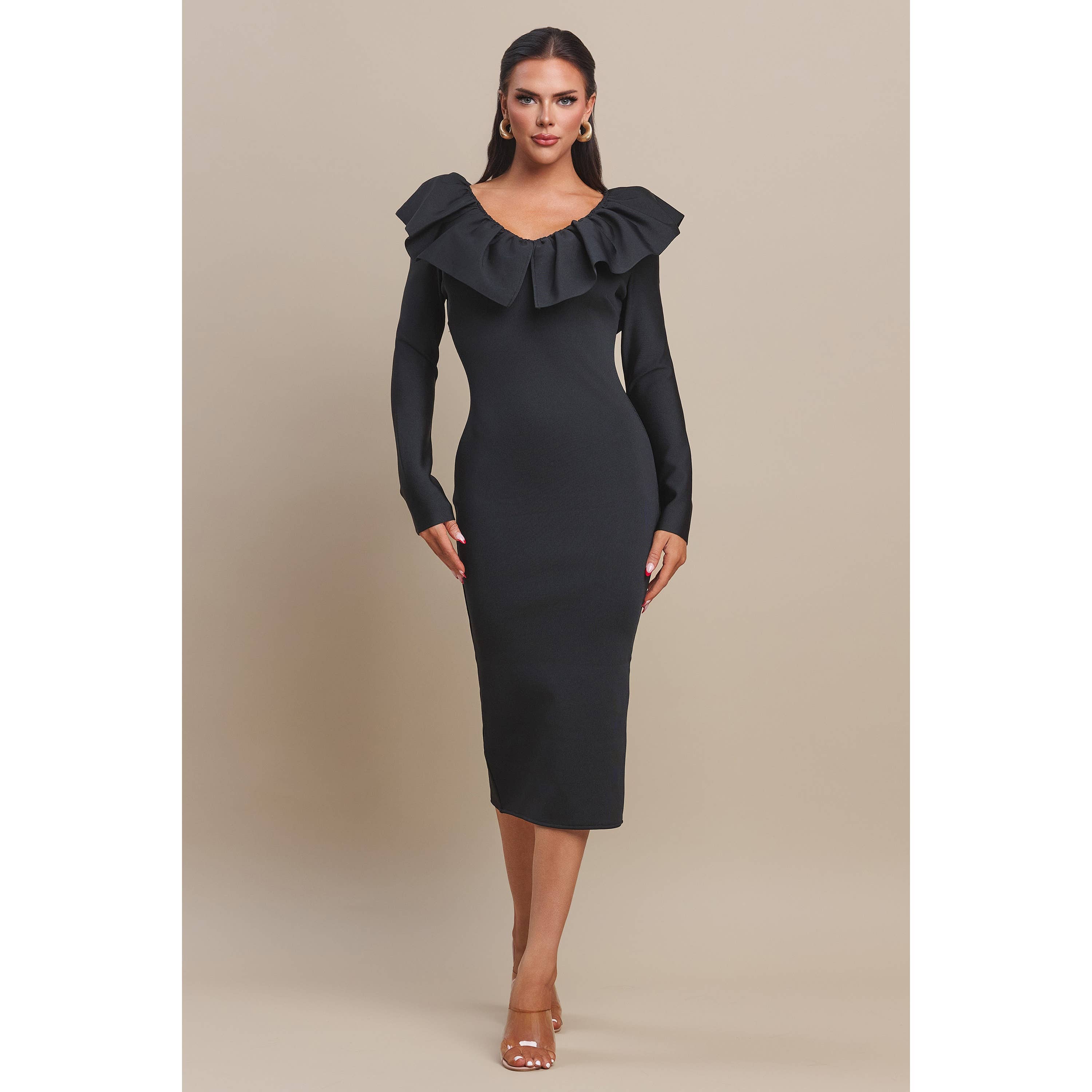 * Style No.: OD2211XY1 PLUS SIZE RUFFLE DETAIL SHOULDER PLUS SIZE MIDI DRESS V-NECK V-SHAPE BACK TRIPLE LAYER SLEEVE SLIT BACK HEM ZIPPER BACK SELF: 95%POLYESTER 5%SPANDEX LINING: 100%POLYESTER Available By BLACK : 12/30/2025 IVORY : 12/30/2025 RED : 12/30/2025 ROSE : 12/30/2025