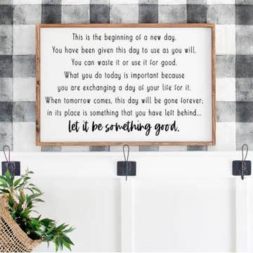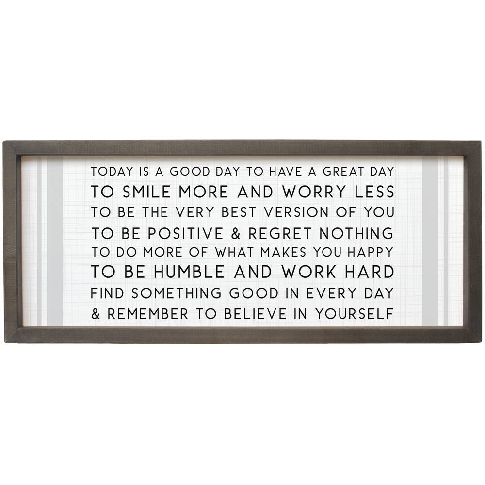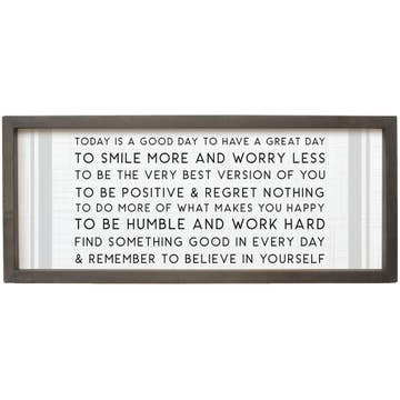 Today is a Good Day to Have a Good Day - This wood framed canvas sign is a simple message that resonates with anyone. It is perfect for a gift shop or decor sign. • Printed with high resolution archival giclee inks • Fine art cotton canvas mounted on wood • Solid hardwood frame in shown stain colors • Sustainable American oak or alder wood • Made in the USA in our Utah studio • MINI 6" tall x 6" wide x 1.25" deep w/ 1/4" thick frame • SMALL 11" tall x 11" wide x 1.25" deep w/ 1/4" thick frame • MEDIUM 15" tall x 15" wide x 1.5" deep w/ 3/4" thick frame • LARGE 20" tall x 20" wide x 1.5" deep w/ 3/4" thick frame • Signs may have +/-1" variations • All signs can stand on a shelf or table (Medium & Large can also hang on a wall) • Farmhouse style frames have small rustic imperfections that make them unique