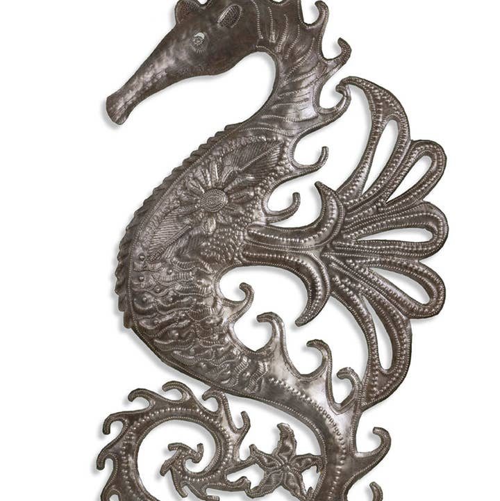 Check out the beautiful design work on the wings of these dragonflies. Sold as an assorted set of five. * Fair Trade Federation-certified steel Haitian metal art set * Steel metal art coated with a protective gloss varnish * Dimensions: 9" x 11" * Handcrafted at the Village Artistique de Noailles in Croix-des-Bouquets, Haiti by Haitian metal artist Wilson Etienne A folk art that dates back to the mid-20th century, Haiti metal art today is the art of recycling and transforming discarded steel oil drums into ornate metal artwork. As handmade Haitian metal art, there will be slight variations from one piece to another, adding to the unique character and value of each piece of metal art.