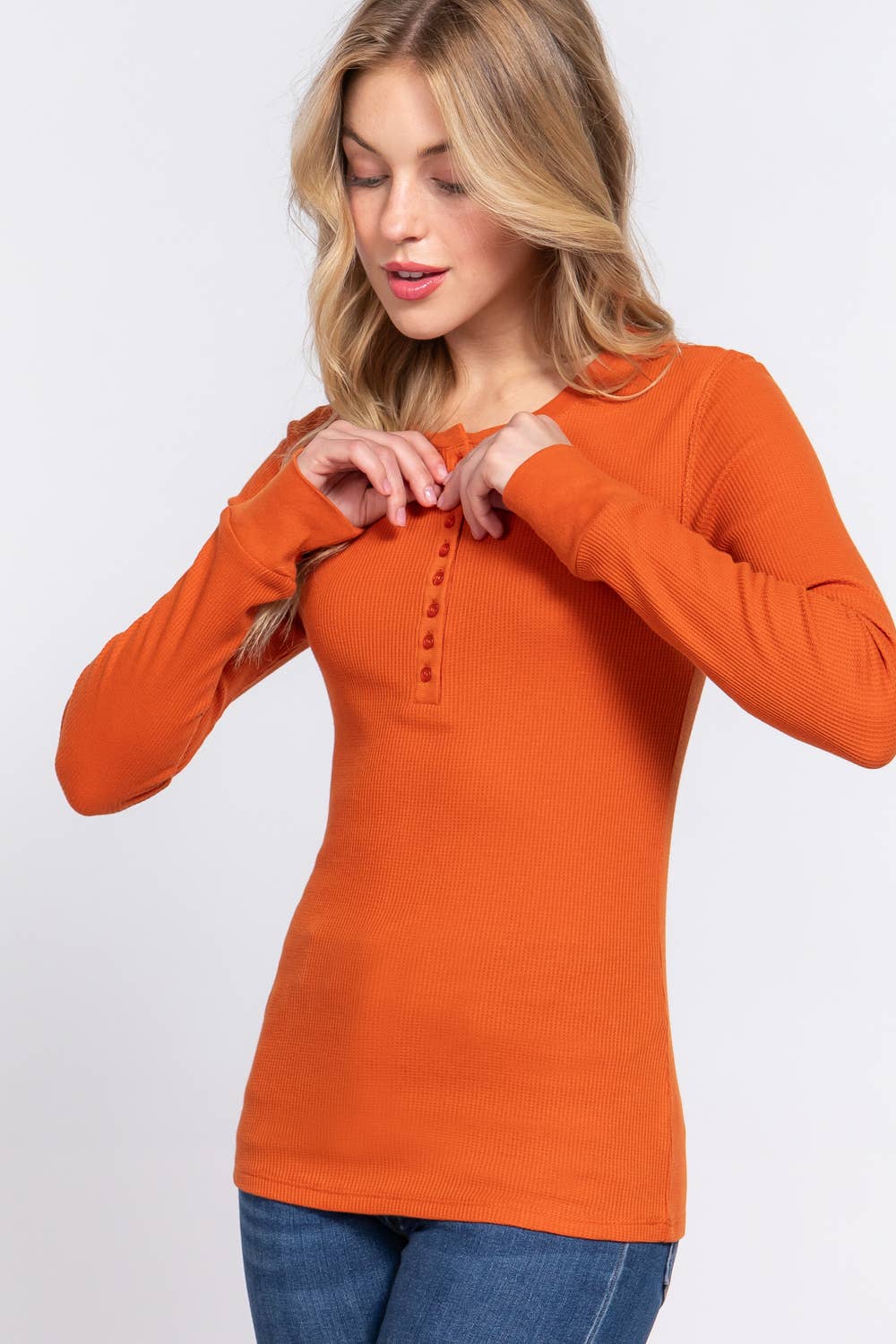 A solid waffle knit top featuring V neckline non-functional button down and long sleeves Size & Fit - Model is 5`8" And Wearing Size Small - Measurements Taken From Size Small - Approx. Length: 18.5"