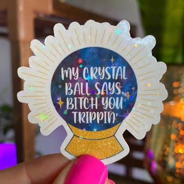 Holographic vinyl sticker, measuring 2 x 3 in, featuring a tarot-inspired drawing of a quilter's hands and notions. Pictured notions include a spool of thread, needle, machine bobbin, snips, rotary cutter, clips, and a seam ripper. There is a light smoke behind the items. Note: color options refer to the hands in the image